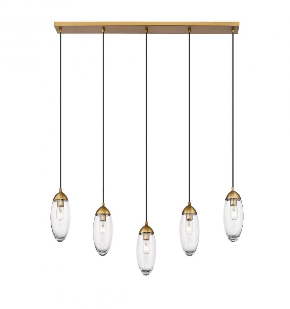 An enticing placement of radiant teardrop glass shades creates a study in architectural artistry perfect to frame a kitchen island or dining space in a contemporary setting. This five-light chandelier delivers organic sensibility with enough pizazz to attract attention as it emits reflective illumination in shades that dangle from a rich rubbed brass finish metal canopy.