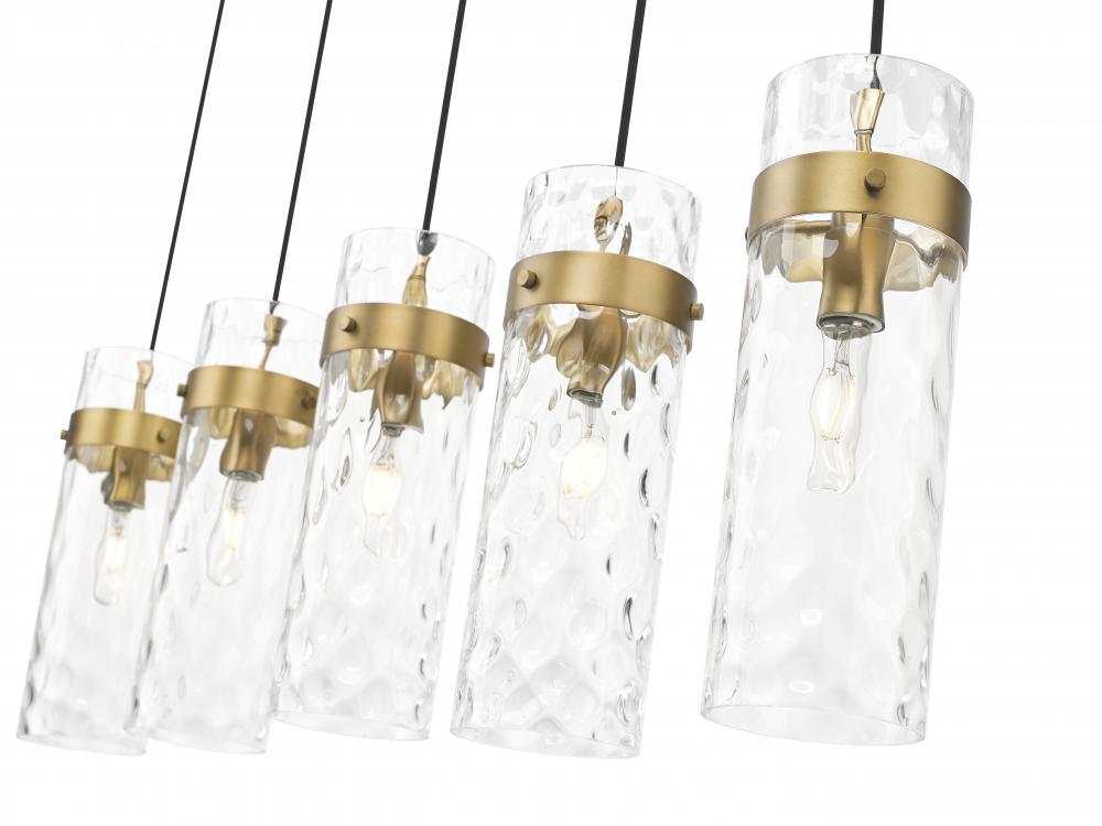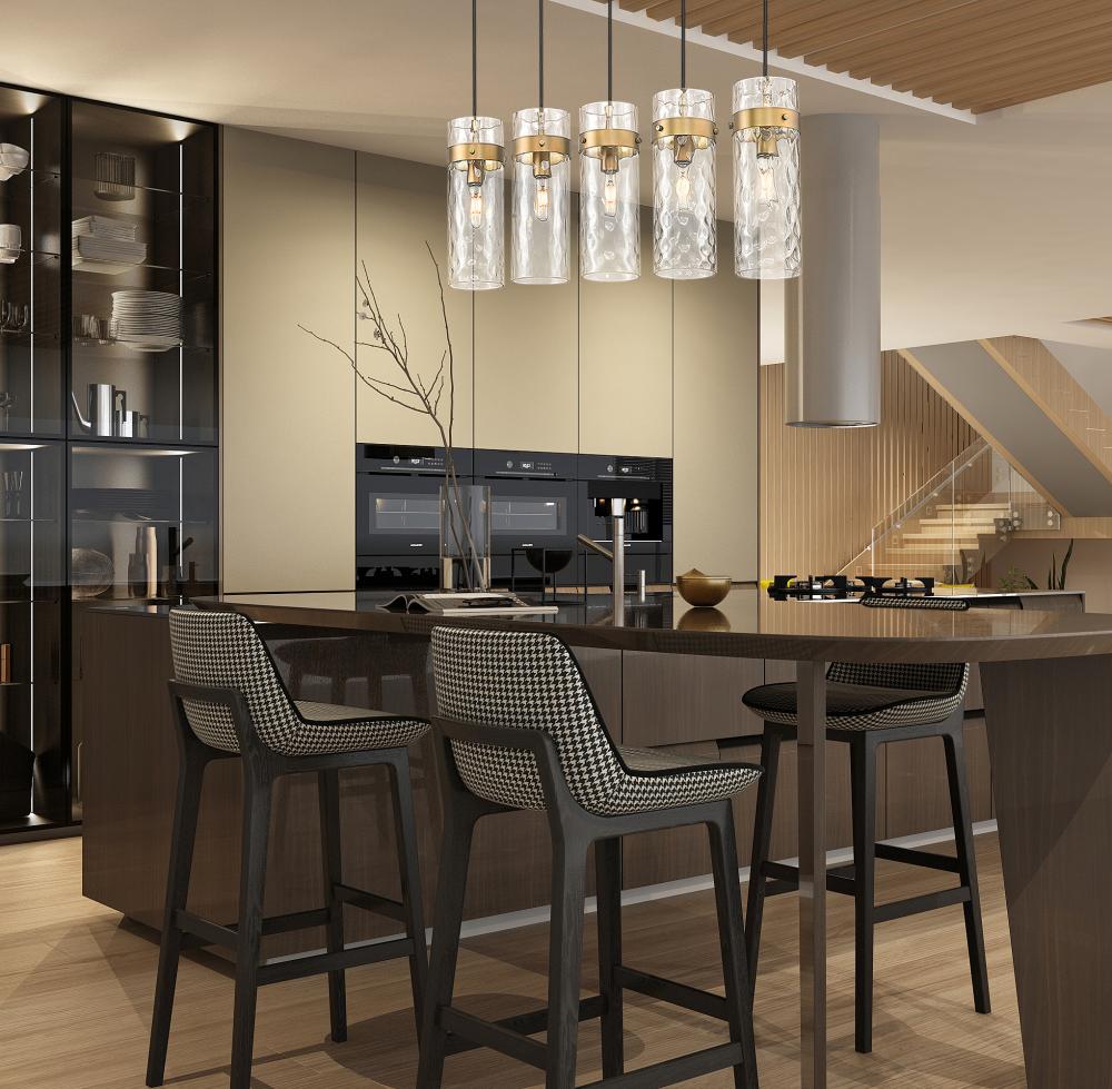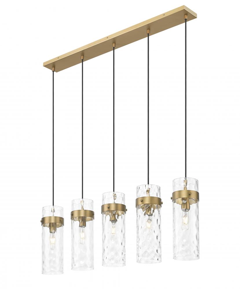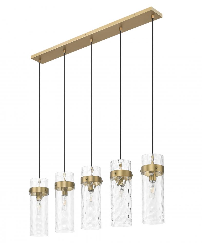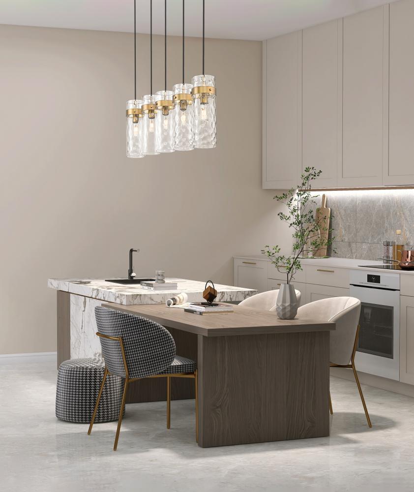 Indulgent in a rubbed brass finish, this modern five-light linear chandelier is a fabulous focal point over a kitchen island or dining table. Its highlighted with cylinders of clear water glass, offering a rippling effect thats sure to enchant. Metal collars add depth and contrast while braided cords are a thoughtful finishing touch.