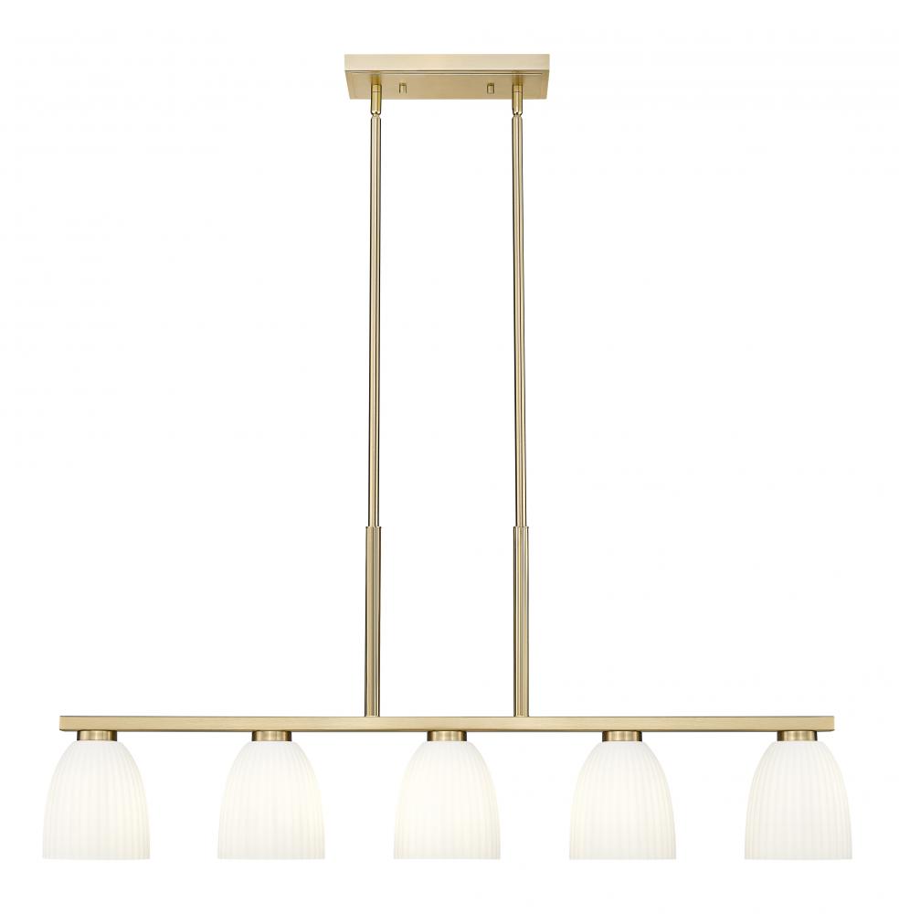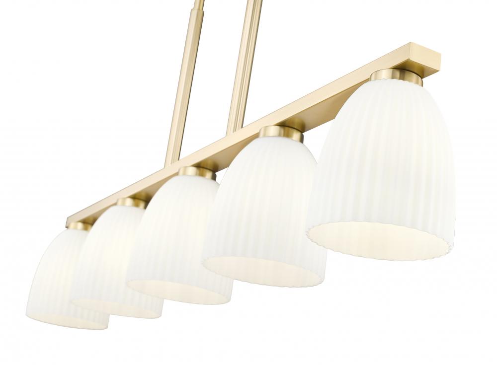 Dressed in a modern gold finish, this five-light linear chandelier stretches across the space with graceful balance and warmth. Ribbed matte opal glass shades diffuse the light into soft, ambient layers that feel calm and elevated. It?s a refined anchor for dining rooms, islands, or anywhere a little glow goes a long way.
