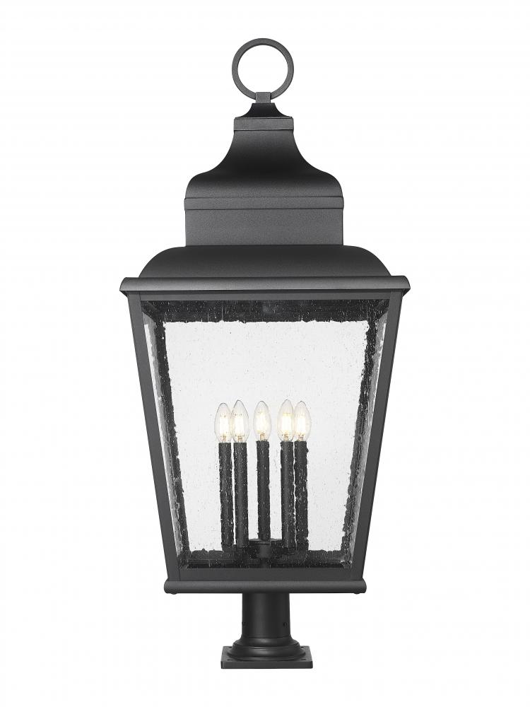 Accents and detail embellish this charming five-light outdoor pier mounted fixture, lifting the aesthetic of a custom outdoor space. Highlighting gardens and walkways, its lantern motif is crafted of sand black finish aluminum with clear seedy glass panels that inspire a dreamy look. Internal candelabra bulb mounts offer a village motif to a dimmable light perfect for 24-hour illumination.