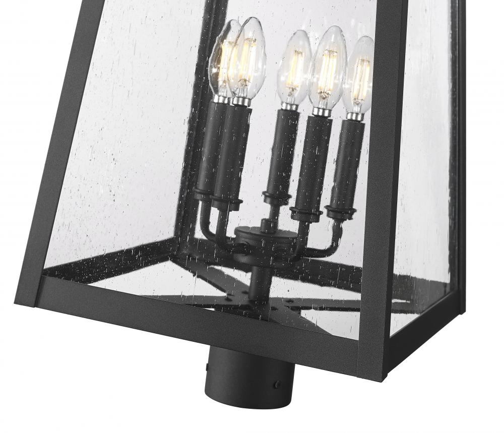 Showcasing a classic lantern-inspired silhouette to augment exterior gardens and walkways, this modern five-light outdoor post mount fixture promises a sophisticated aesthetic. Perfect for topping a post, this fixture features a Coastal black painted finish over aluminum, with clear seedy glass panels that offer vintage character. This dimmable outdoor light raises the level of elegance in a custom outdoor setting.