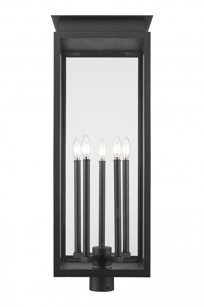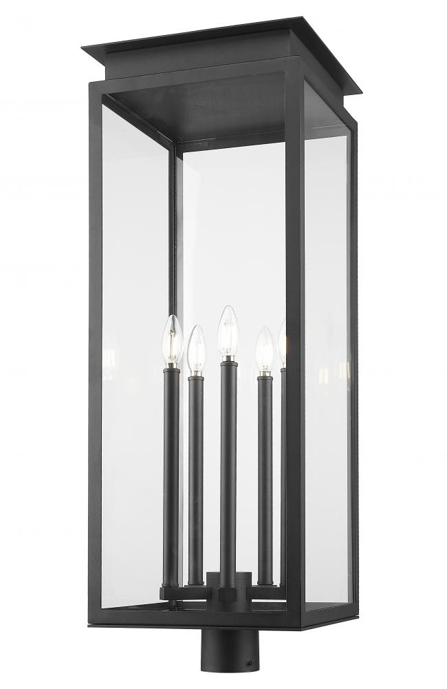 Highlight your exterior space with the clean, precise style of this transitional five-light outdoor post mount light. It features tall candelabra lights complete with a glass surround. A layered cap design and stepped trim create a hint of dimensionality, perfect for your decks and patios.