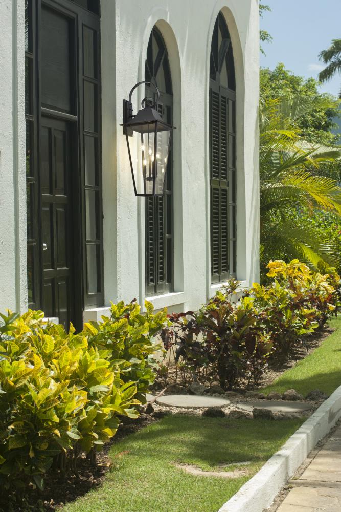 Introduce an inviting ambiance to your entryway with a traditional five-light outdoor wall light. In Coastal black, it delivers plenty of illumination, setting the tone for a welcoming porch or patio. Its elongated lantern silhouette is paired with beveled glass and a scroll arm, perfect for charm and curb appeal.