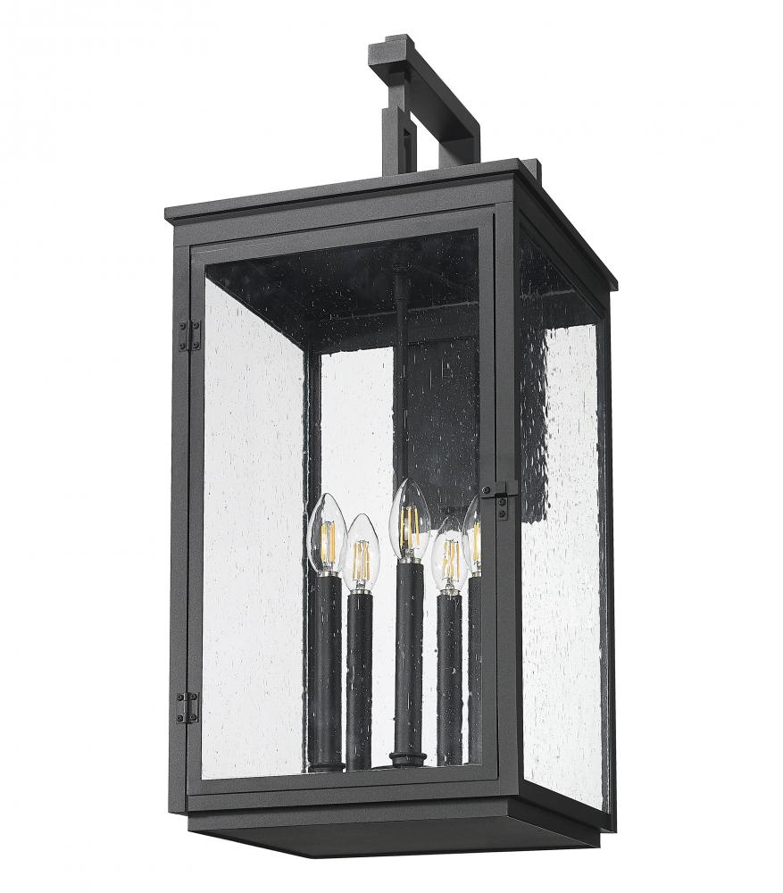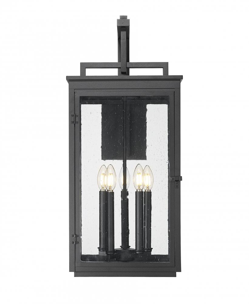 Evenings feel richer under the glow of five candle-style lights framed in a deep sand black finish. The clear seedy glass softens each flicker into something magical and inviting. This piece adds stately presence to wide facades or expansive porch walls.