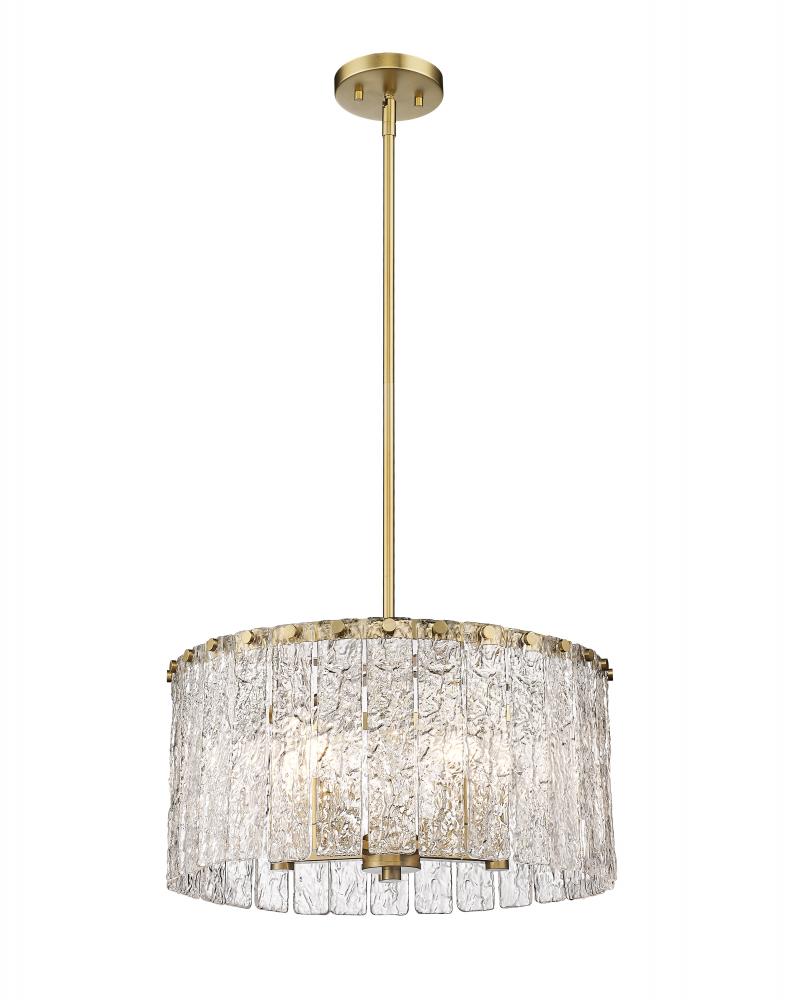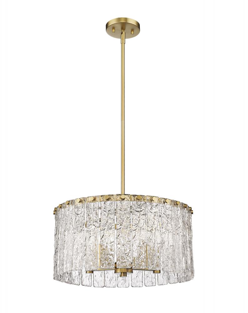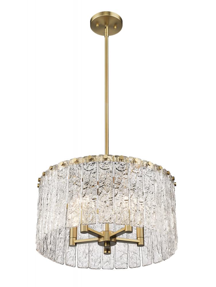 Capture the romantic impact of a frosty environment with a light fixture offering versatility and verve. The Glacier round five-light pendant features clear textured glass panels that emulate melting ice, an extraordinary effect with dramatic impact in a foyer or main living area. Modern gold finish steel is placed as a crown frame, adding a consistency in palette and motif and embellishing with a blend of glam and industrial ambiance.