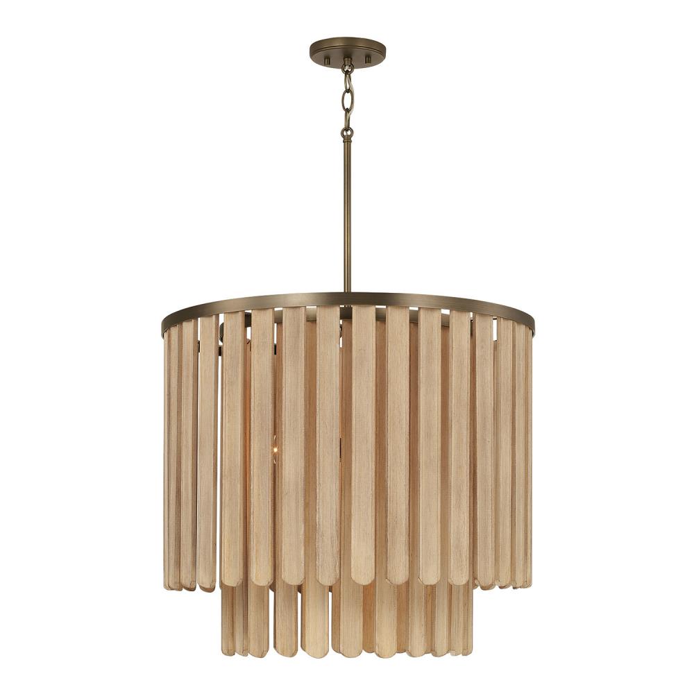 Handcrafted of mango wood, the Jada Medium Pendant celebrates muted earthtones and modern organic style. The subtly distressed Nordic Grey wood adornments are carved to bring elegant texture and depth to the tiered form, complemented with the Dark Brass metal frame.