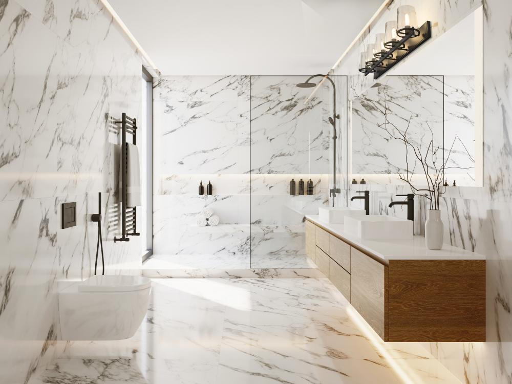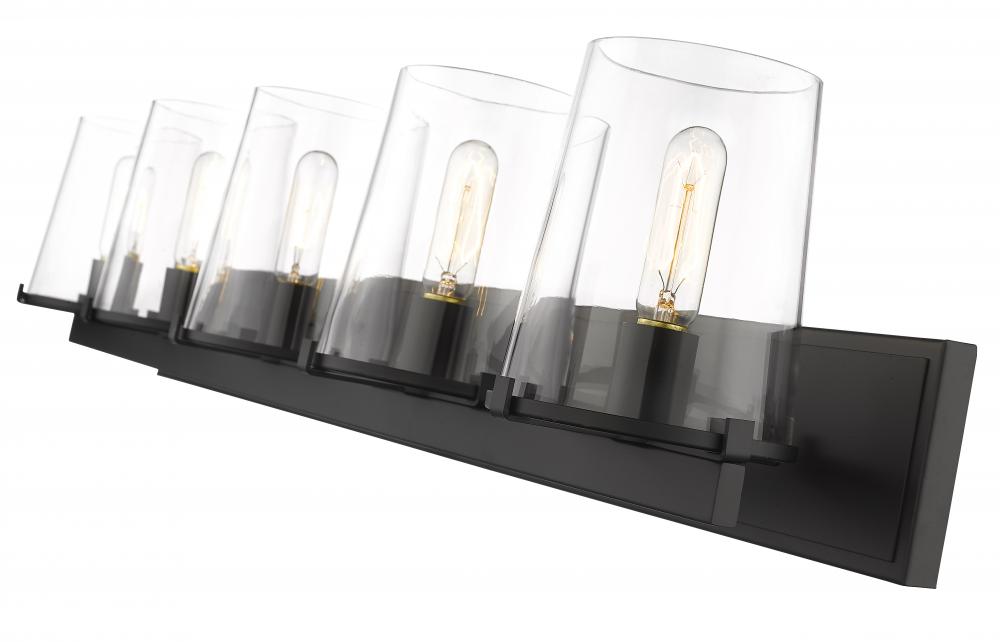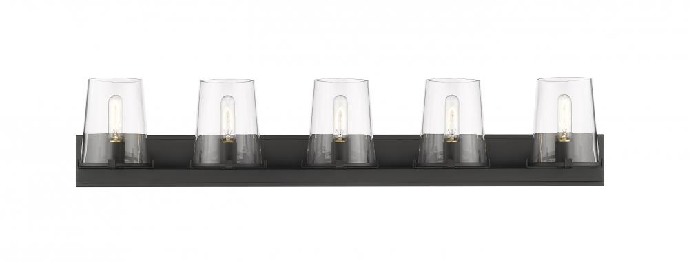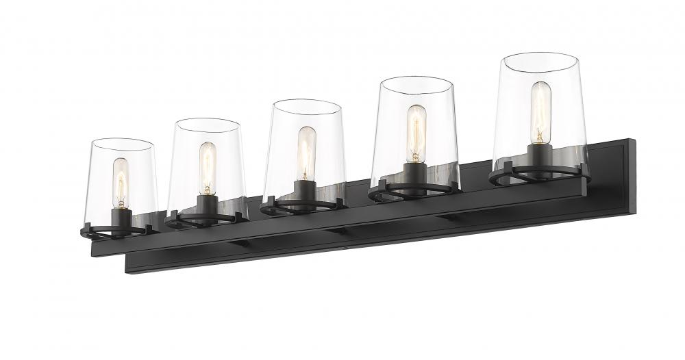 Conquer lighting challenges in a large bath space with the enticing Callista five-light vanity light and its mix of nautical vibes with village charm. Fashioned with a frame featuring clean lines and construction of hand-crafted matte black finish steel, it defines spatial elements and adds a dramatic aesthetic. Delicate-looking clear tapered glass shades align to filter ambient lighting as well as provide a sophisticated glam look.
