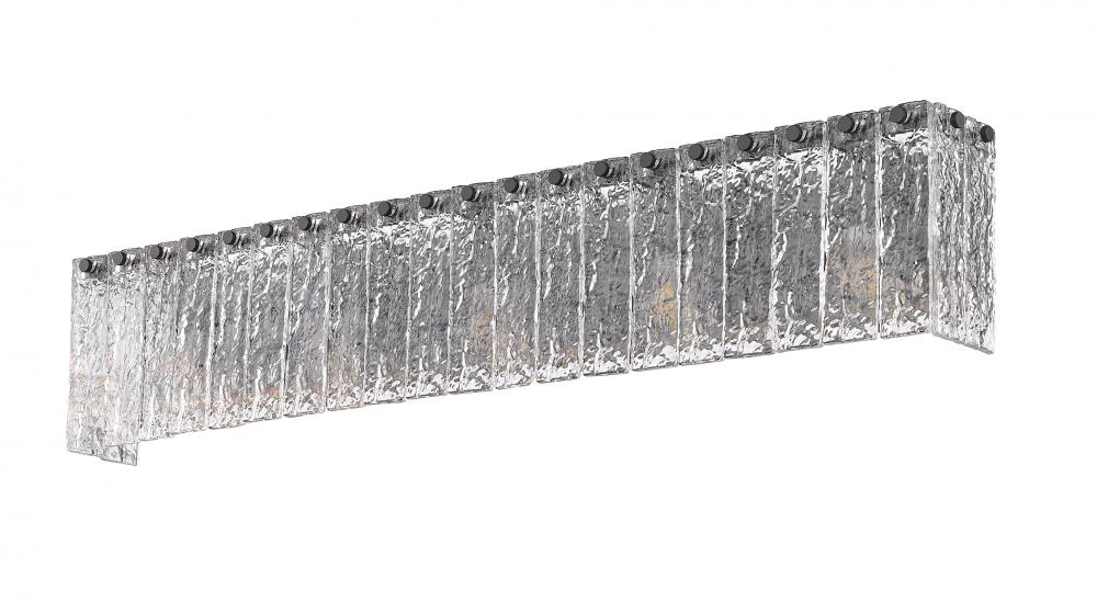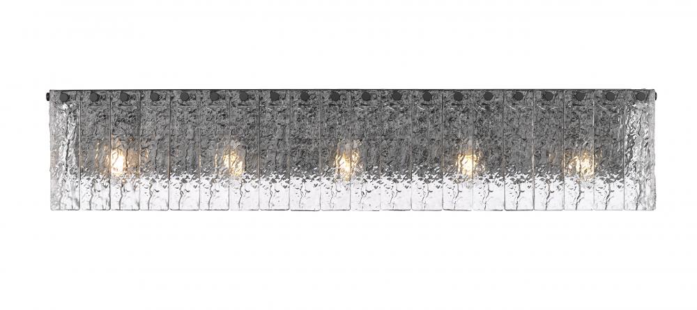 A bold finish of matte black over durable steel is the perfect choice for this modern five-light vanity bath light. A sophisticated centerpiece, it boasts flat bolt head details that secure vertical panels of clear textured glass, evoking melting ice to create impeccable texture and dimensionality.