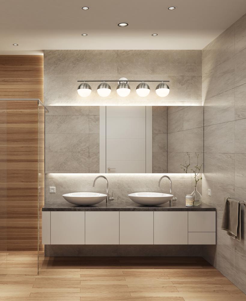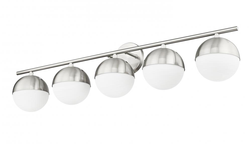 Light a large en suite with the impressive span of this mid-century five-light vanity bath light. Perfect for bright, glare-free illumination, it features orbs shades of matte opal glass, complete with metal shields for a clean, fresh look and feel. A brushed nickel finish adds sleek sophistication.