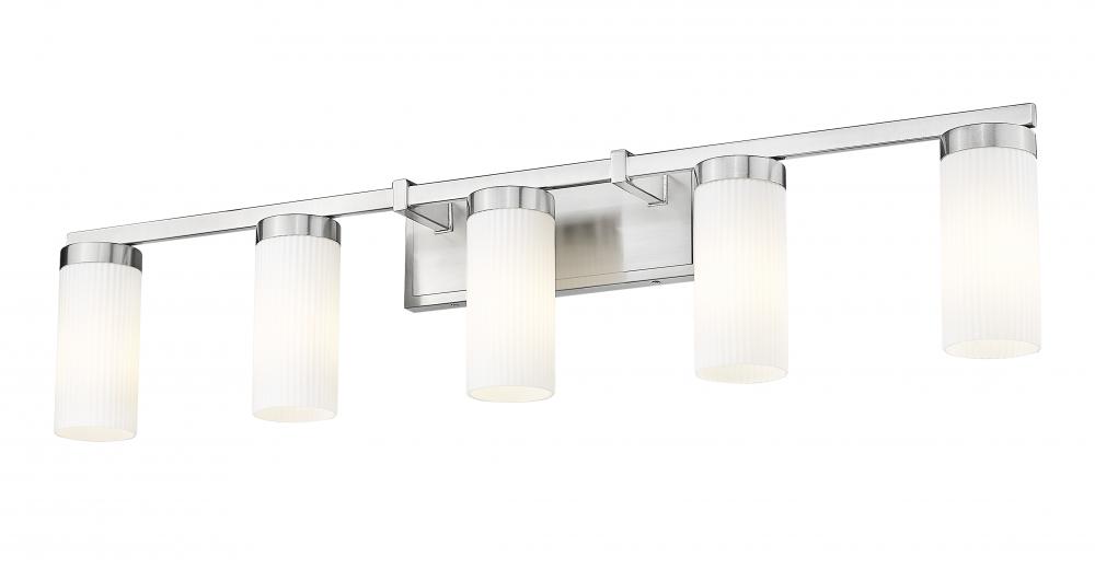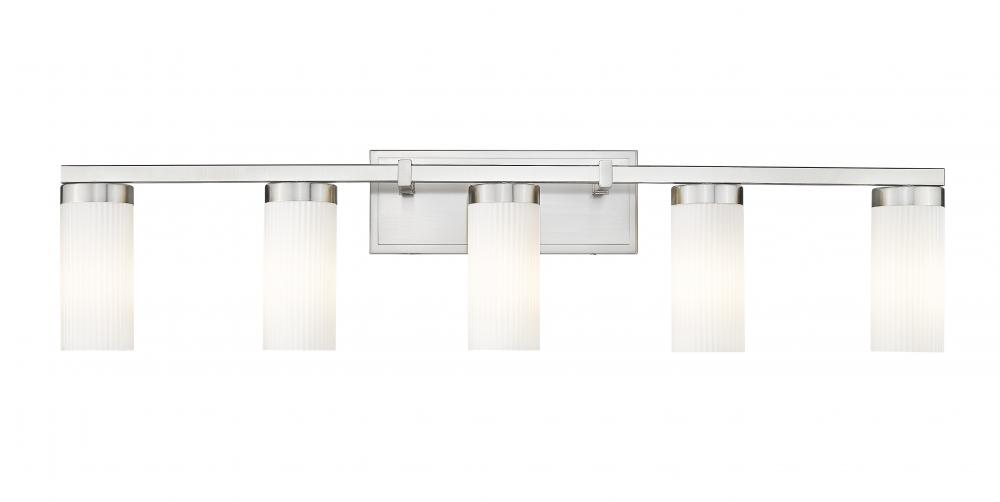 Designed to span wide with grace, this brushed nickel vanity light offers five glowing points of light framed in soft ribbed glass. The clean-lined backplate adds structure without overpowering the design. Perfect for oversized vanities, it brings clarity and calm to your daily routine.