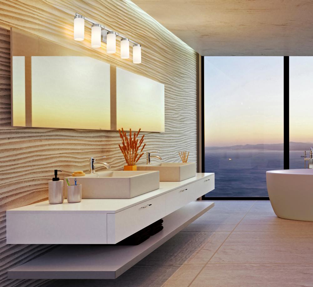 Now available in Brushed Nickel and Chrome finishes, and a choice of 1-, 3- and 5-light versions, the Danica series features a rectangular wall plate and ribbed glass for modern appeal.