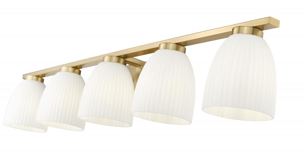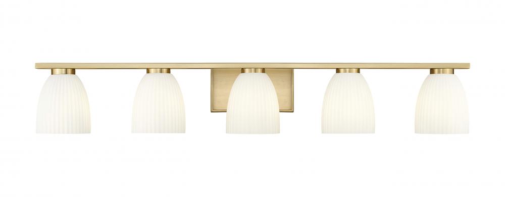 Detailed in a warm modern gold finish, this five-light vanity fixture strikes a luxurious balance between structure and softness. Ribbed matte opal glass shades add texture and a gentle diffusion that flatters every space. It?s the kind of detail that makes a room feel both curated and comfortable.