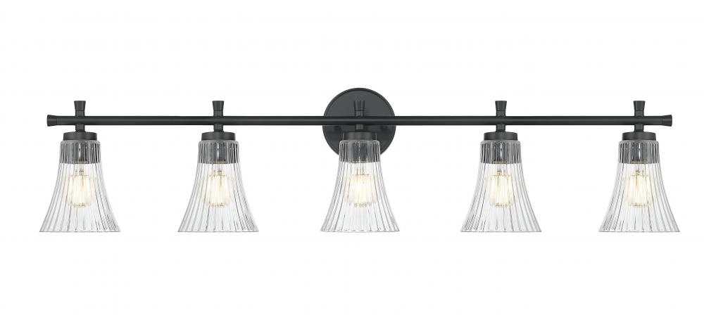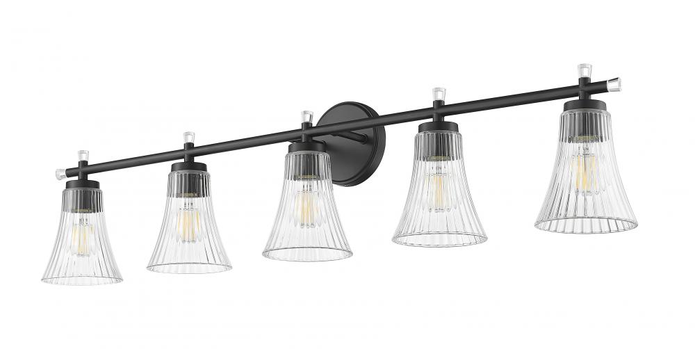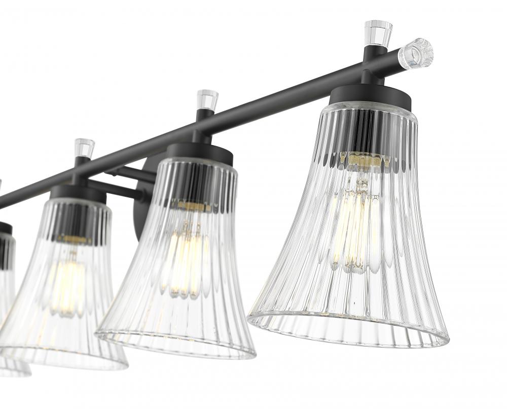 This five-light vanity fixture contrasts the richness of a matte black finish with the light-catching shimmer of fluted clear glass. Bold yet graceful, it creates a stunning silhouette that balances structure with softness. The result is a striking focal point that feels both grounded and gracefully refined.