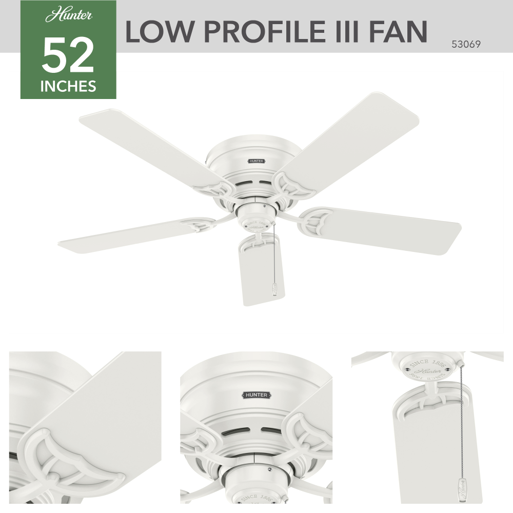 The Hunter Low Profile® III traditional ceiling fan is designed with housing specially crafted to fit flush to the ceiling making it ideal for use in your large rooms with low ceilings. Featuring two classic finishes, this low-profile ceiling fan without light is powered by a three-speed WhisperWind® motor to deliver ultra-powerful and whisper-quiet performance.