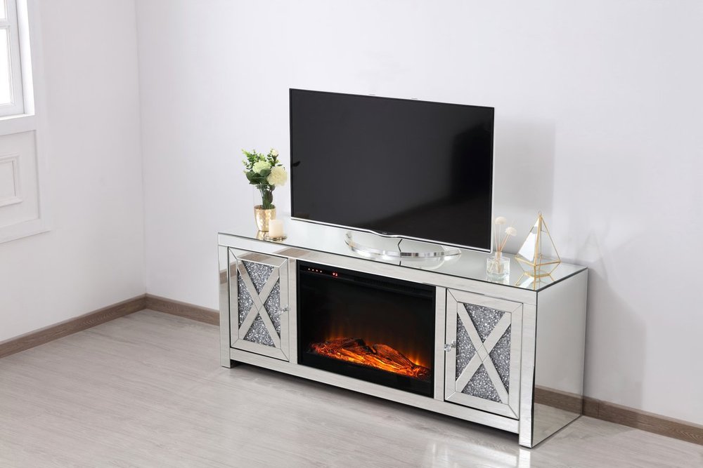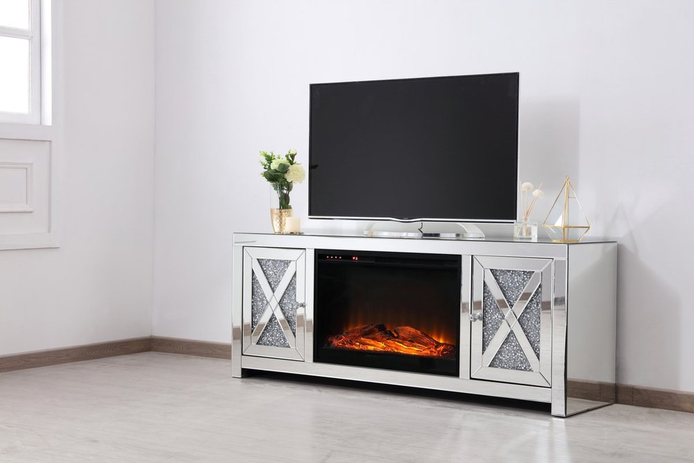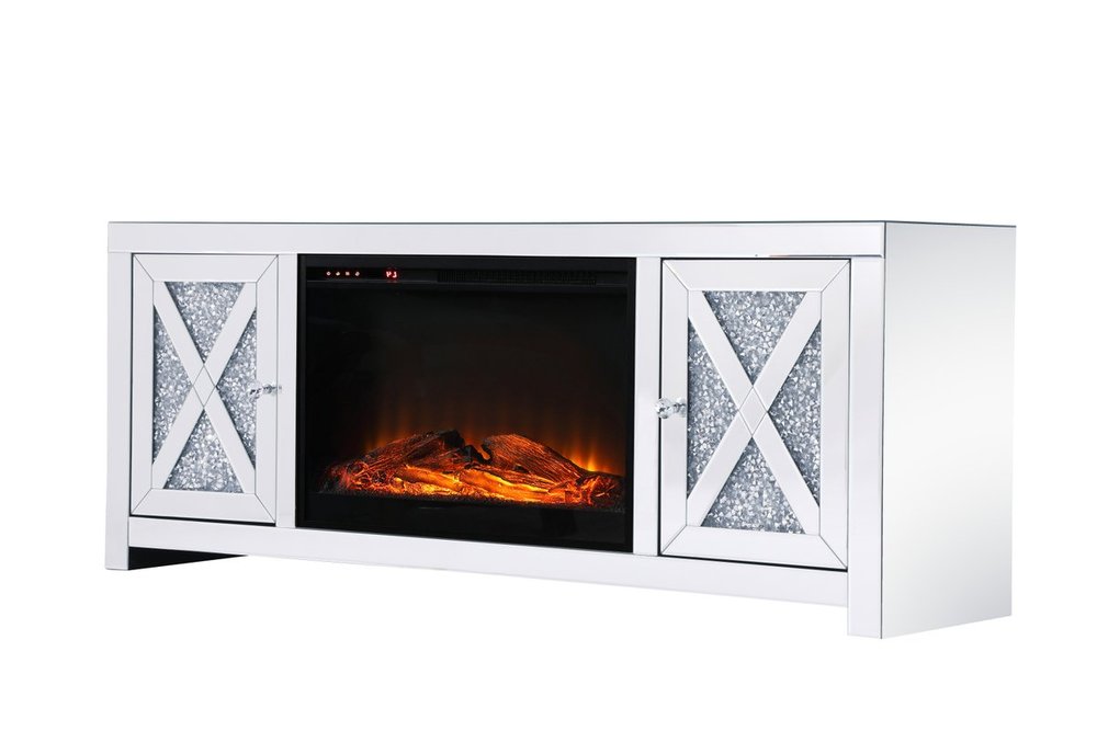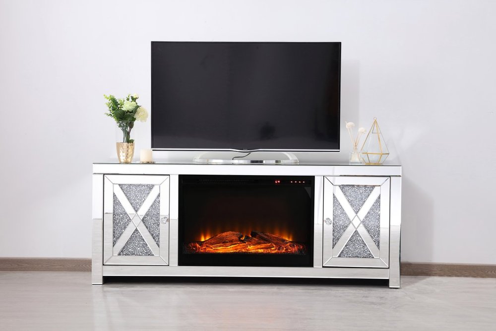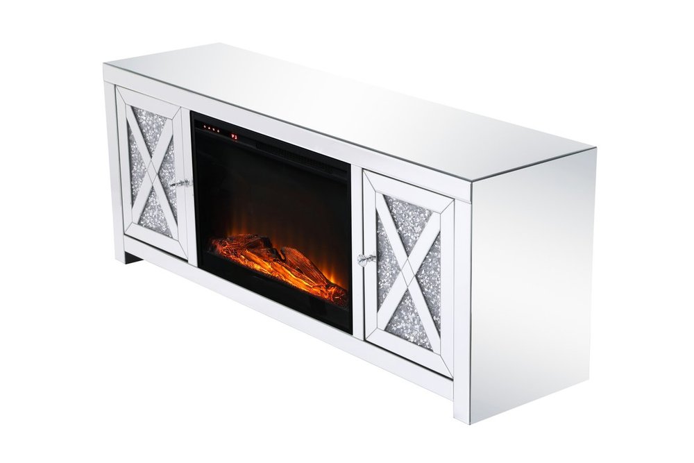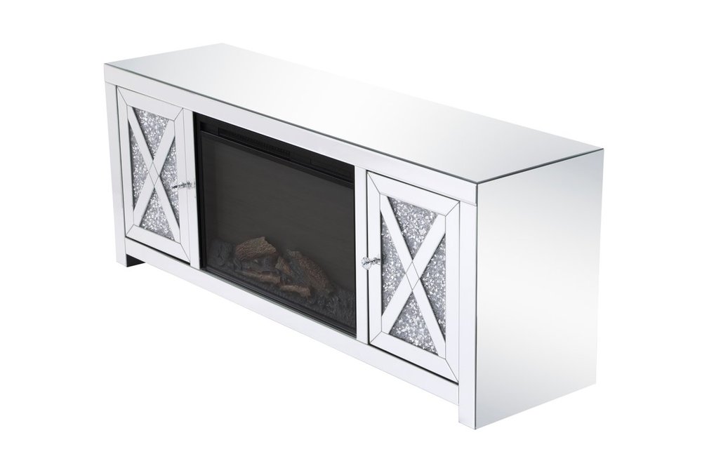 59 in. crystal mirrored TV stand with wood log insert fireplace