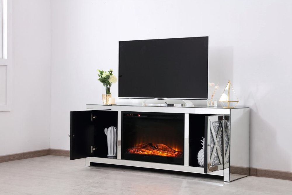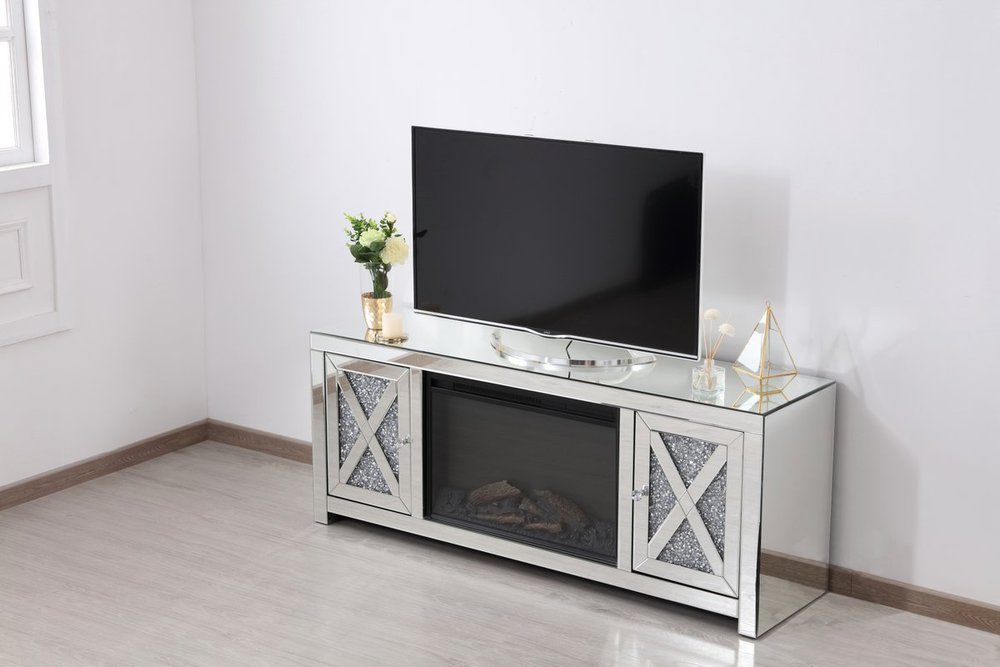 This mirror paneled tv stand fireplace combination is the perfect complement to your entertainment spaces. You can enjoy watching endless movies, host premier nights, or play video games until the stars are sparkling just as bright as the silver crystals that embellish the panels within the X-shaped details of the cabinet doors, which opens to reveal a storage area that is the perfect place to put away board games and various trinkets. Whether you are hosting a formal dinner party with associates or a casual get together with your loved ones, the comfort of the crackling fire in the wood log fireplace insert will put all your guests in a relaxed and merry mood. The perfect home for your tv, movies, and board games, this stand combines sparkling beauty with function.