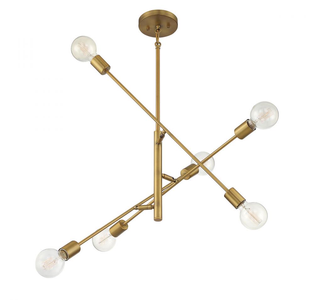 This Meridian 6-light chandelier features adjustable arms, allowing you to create your own lighting look and change it up on the fly. Its simple and streamlined design makes it a smart choice for brightening up rooms of contemporary, modern or industrial decor styles. Finished in natural brass. This chandelier is 12" in height and 26" in width, plus it includes four 12" downrods and one 6" downrod to let you adjust the height for a maximum of 66". This chandelier uses 6 medium size bulbs of up to 60 watts each, is LED compatible, is dimmable and can be used on a sloped ceiling.