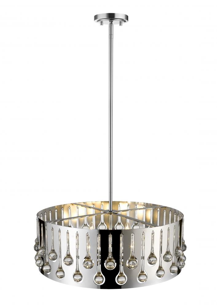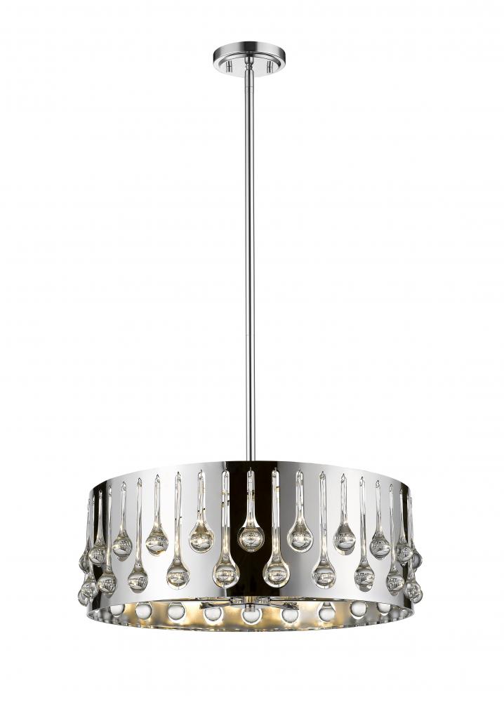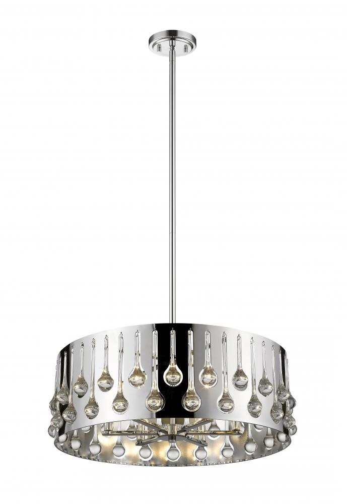 Capture the perfect blend of contemporary and transitional with an artistic and glamorous six-light pendant. Chrome finish steel offers luster to a round frame displaying drops of crystal glass, creating a personality-rich fixture for a dining or living space.