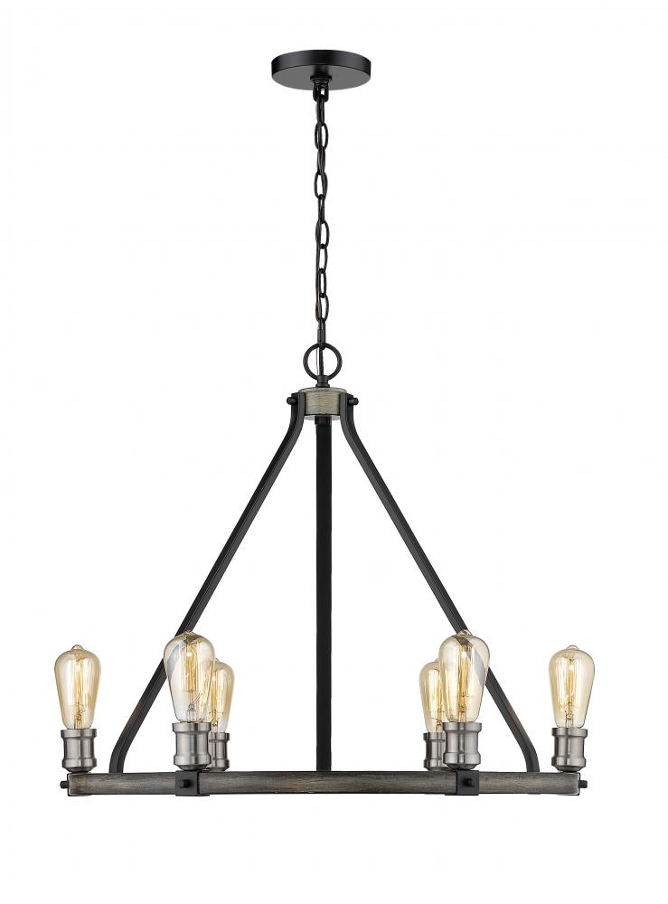The ring of exposed lightbulbs from this six-light faux barnwood chandelier is perfect for an entryway or large dining room. Celebrate modern industrialism with the distressed ashen finish.