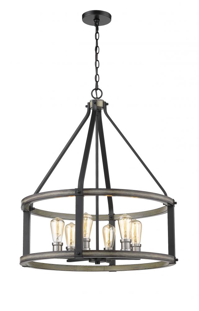 Featuring a cage-inspired frame, this six-light pendant light completes a modern motif. The faux barnwood construction is sleek with an ashen hue and exposed lightbulbs.