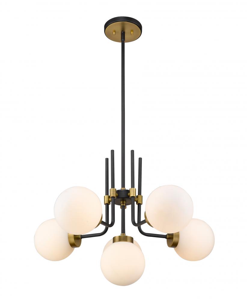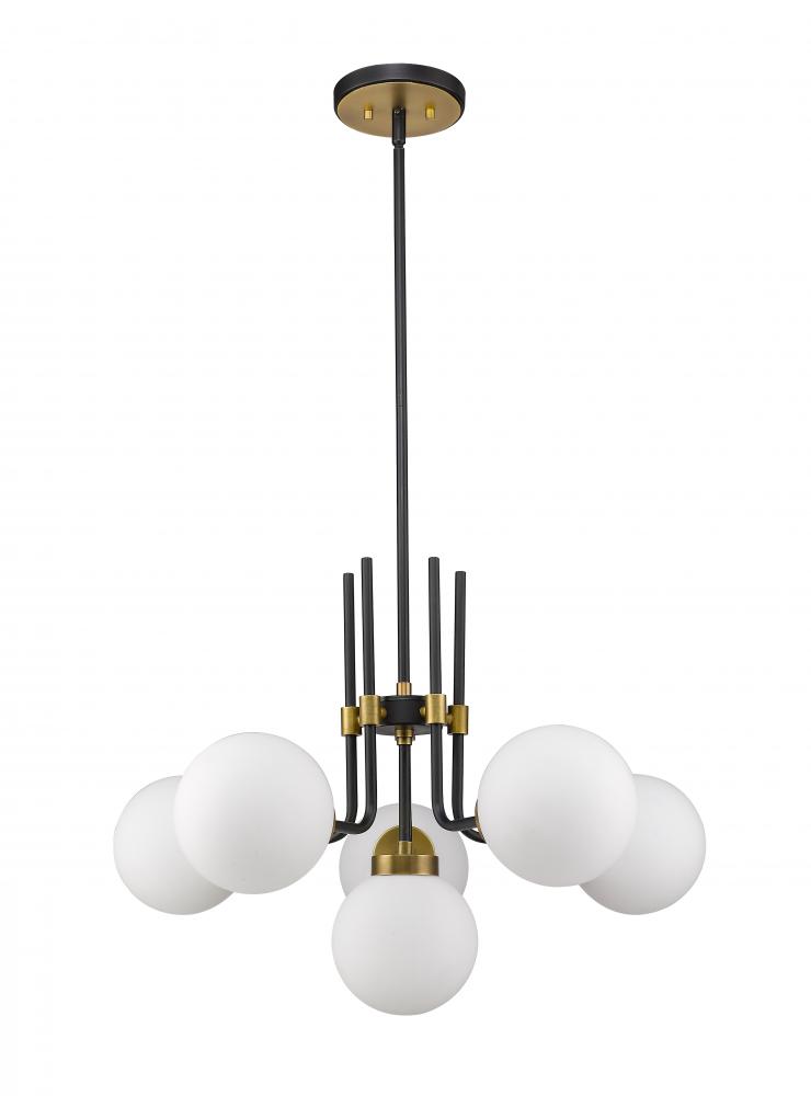 The rich tones of this six-light chandelier add a magnificent aura to your home. Its fashioned with a matte black and olde brass finish and opal shades for the warm glow youre looking for. This beauty will uplift any space in the home, whether its the dining room, foyer, hallway, or kitchen.