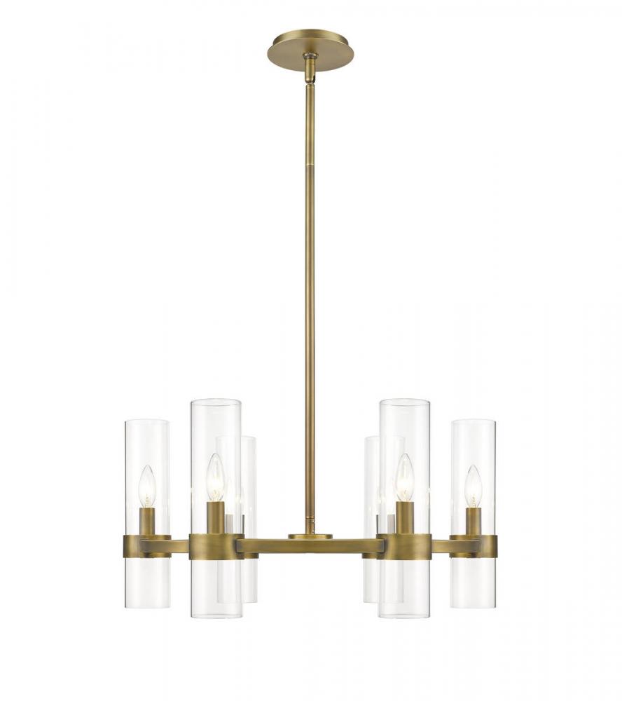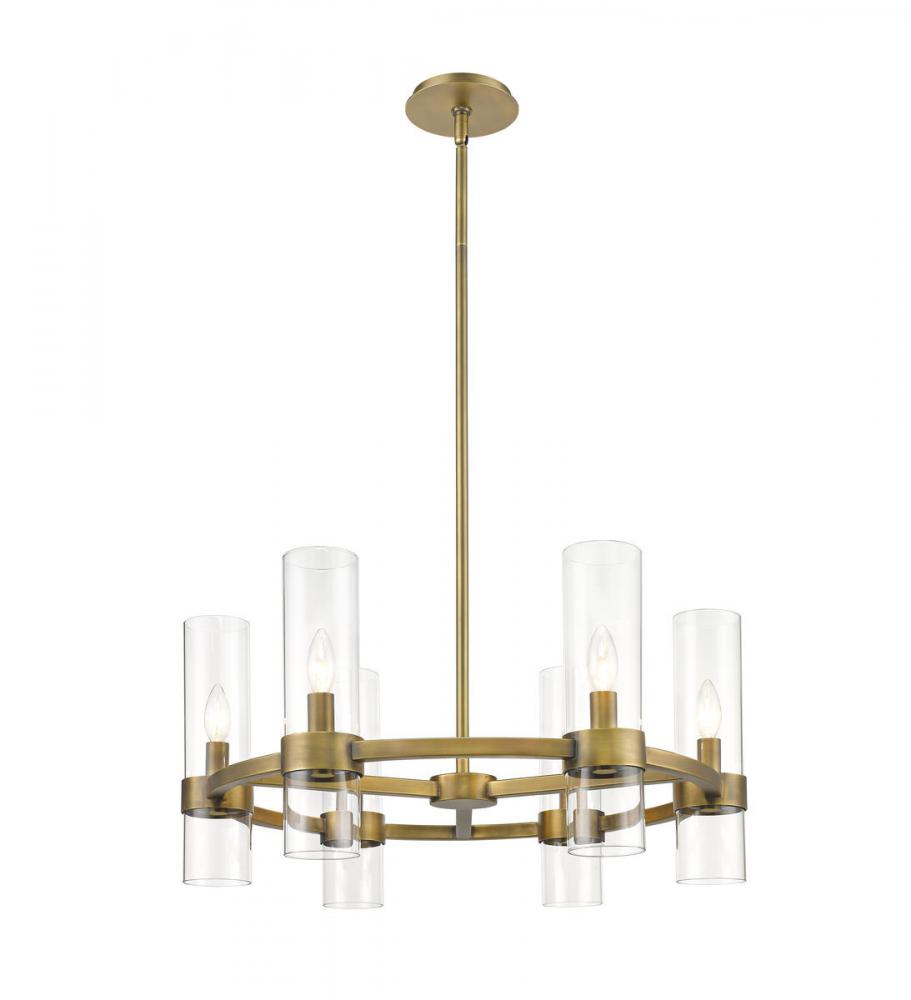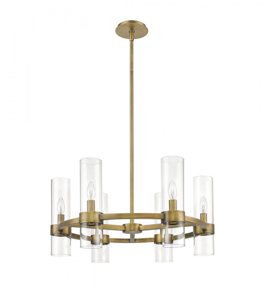 Take a minimalist approach to lighting a custom space, starting with the sophisticated design of this rubbed brass iron and glass six-light chandelier. Perfect for a small- to mid-sized contemporary dining room, kitchen, or hallway, the Datus chandelier delivers chic style with a round frame crafted of warm rubbed brass finish steel, dressed up with delicate clear glass cylinder shades.