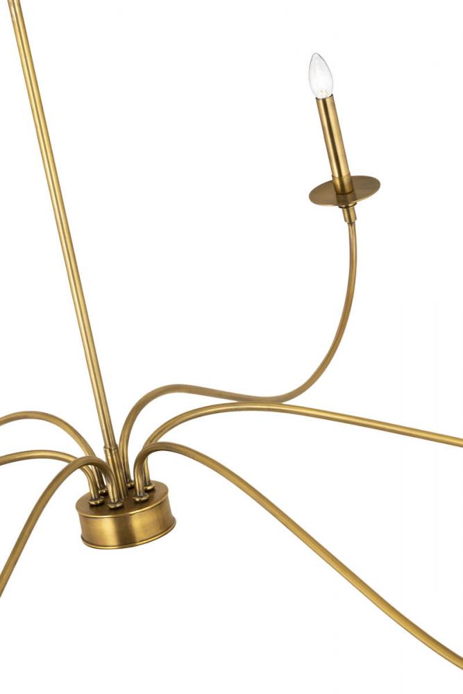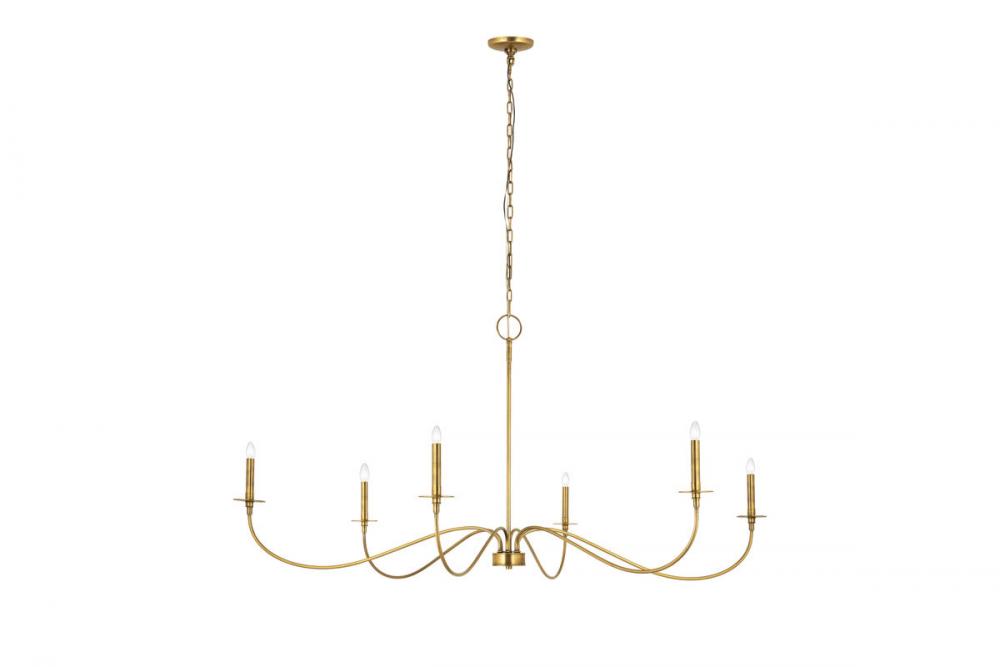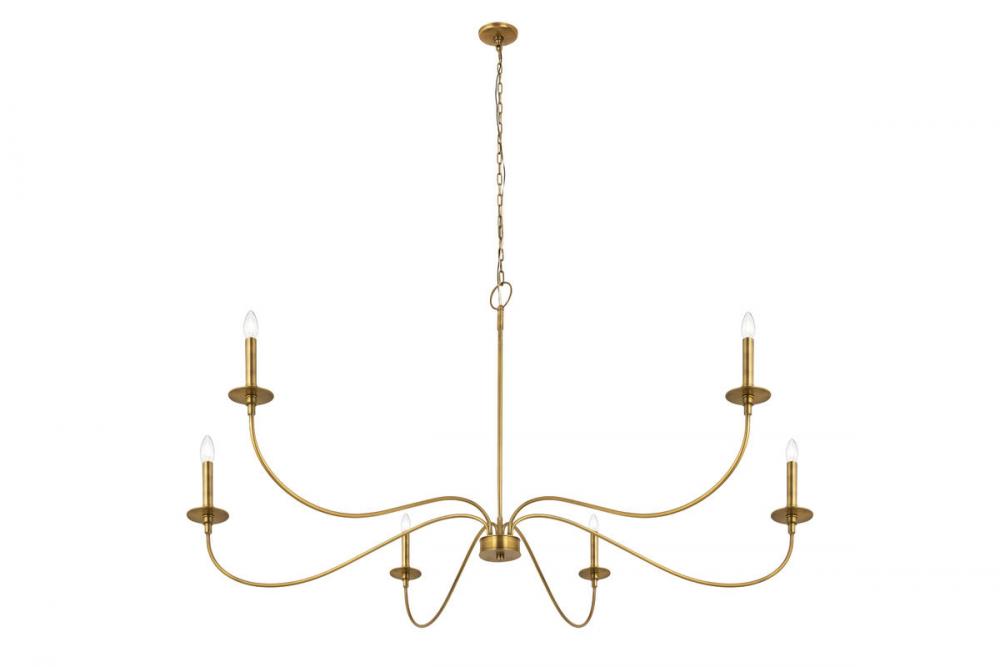 Extreme elegance serves both modern and traditional design schemes with a romantic look when this six-light chandelier delivers graceful charm in a living room, entryway, or dining room. Crafted of warm rubbed brass finish steel, its long, flared arms create a careful arrangement for placement of candelabra-style bulbs that borrow from a traditional motif. This chandelier is ideal for larger living spaces.