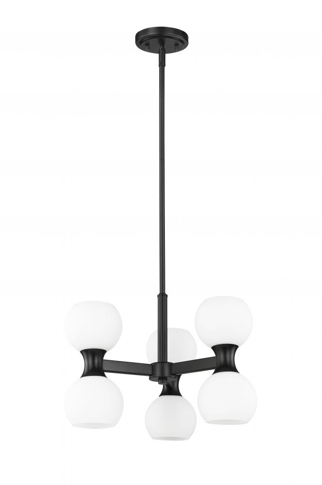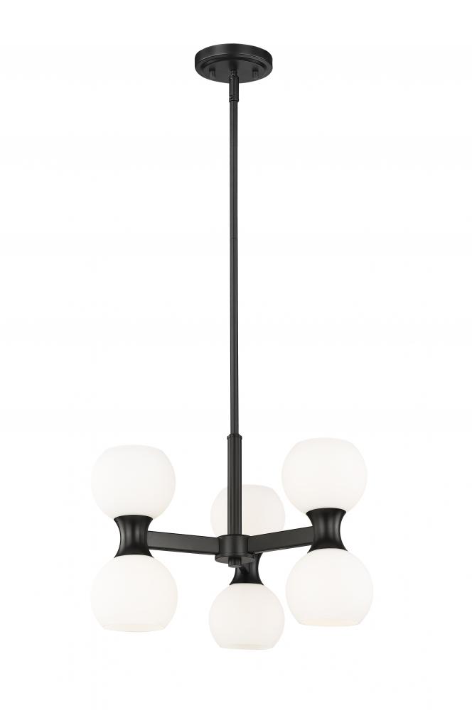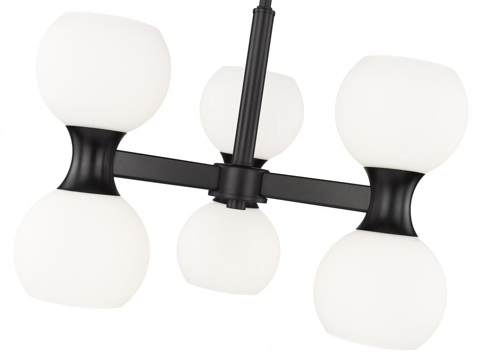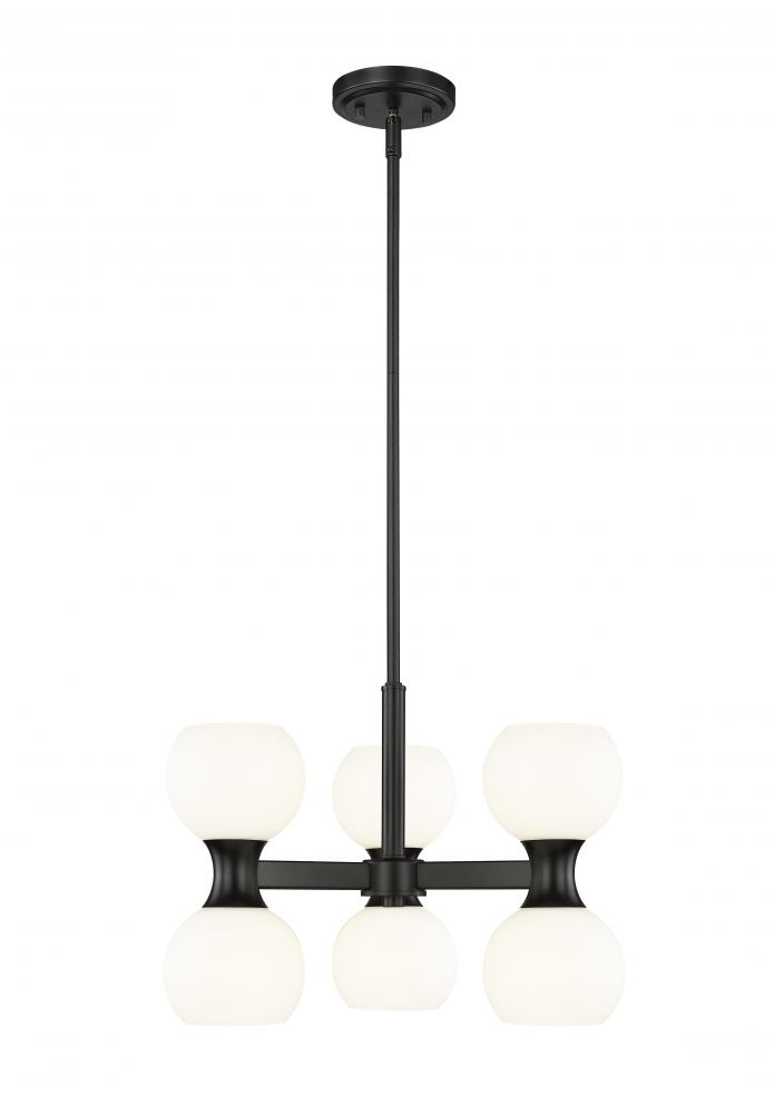 A snappy contrast of matte black steel framing and matte opal glass globe shades adds up to festivity in this delightful six-light chandelier from the Artemis collection. An example of the charming mix of Art Deco and Mid-Century Modern, it adds unmistakable personality to a dining space, living area, or entryway. Embrace the basic yet standout look of uplighting and downlighting in one stellar fixture that becomes a focal point in any setting.