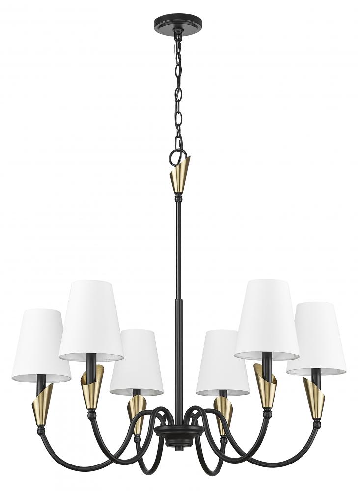 This chandelier draws the eye with its sweeping lines and luminous finishes, offering a modern update to timeless form. The matte black structure is lifted by gold accents, while six white shades diffuse the light in soft, even layers. It?s statement lighting that still feels delicate.