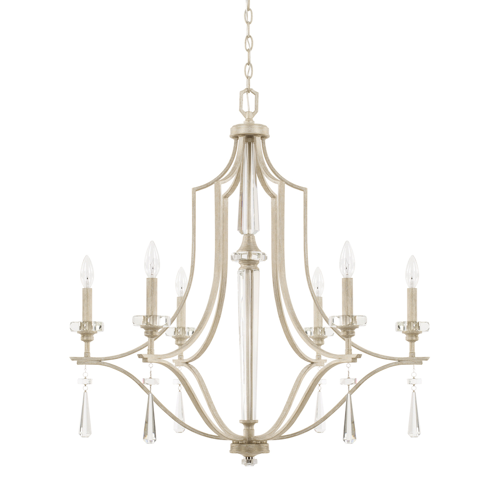 Graceful curves finished in Winter White and K9 crystal-fluted columns define the Serena 6-light chandelier. Exuding refined elegance and fashionably transitional flair, this lovely fixture is perfect as a dining room chandelier. Try a pair to illuminate a wider table or as an entryway chandelier for a striking first impression.