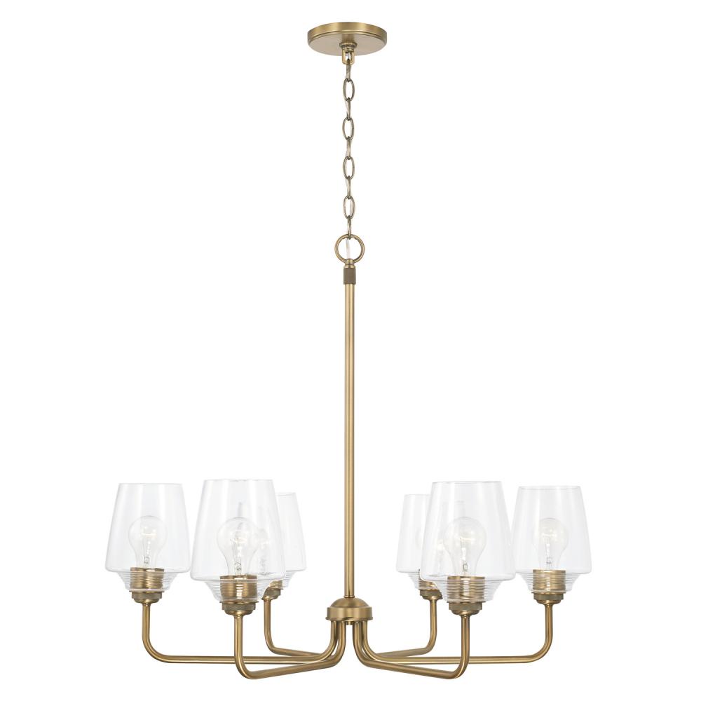 A modern update to the schoolhouse shade, the Miller 6-Light Chandelier feels both classic and contemporary. The ribbed glass detail creates a layer of visual interest and the subtle sheen of the Aged Brass finish emits a unique glow.