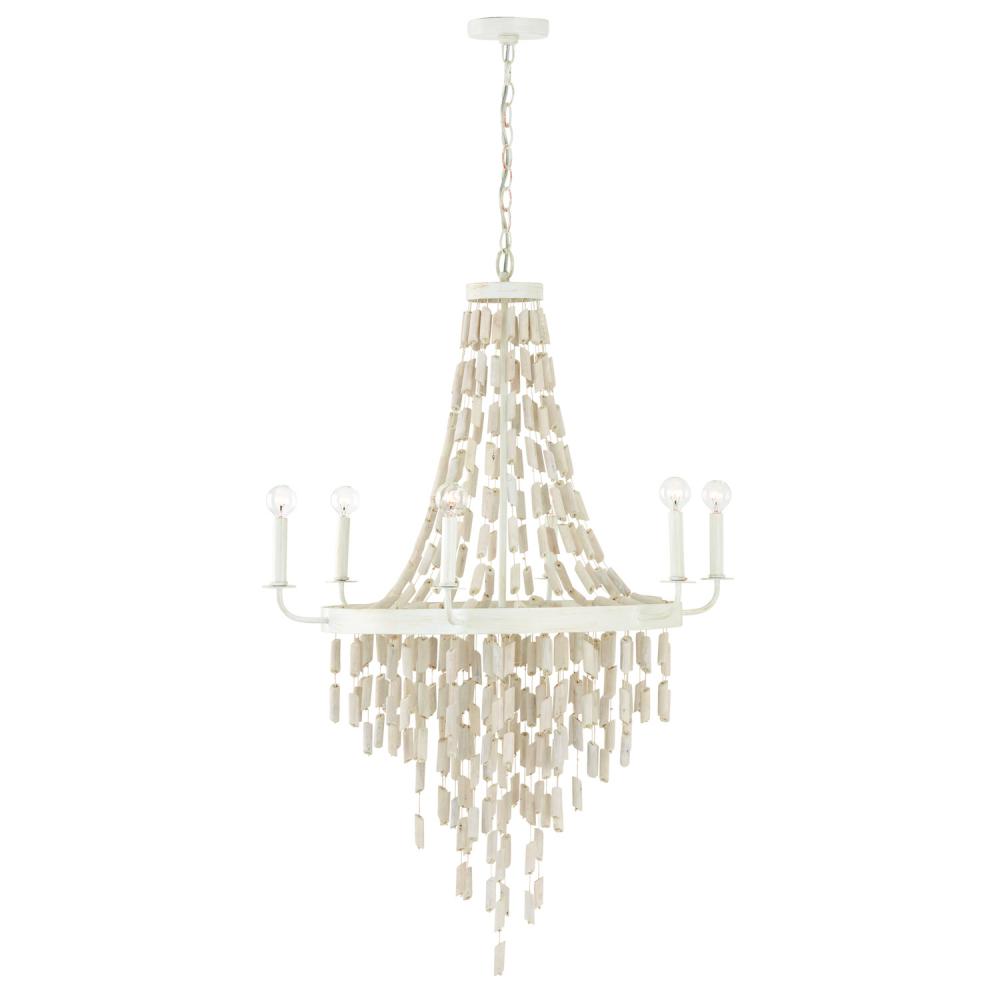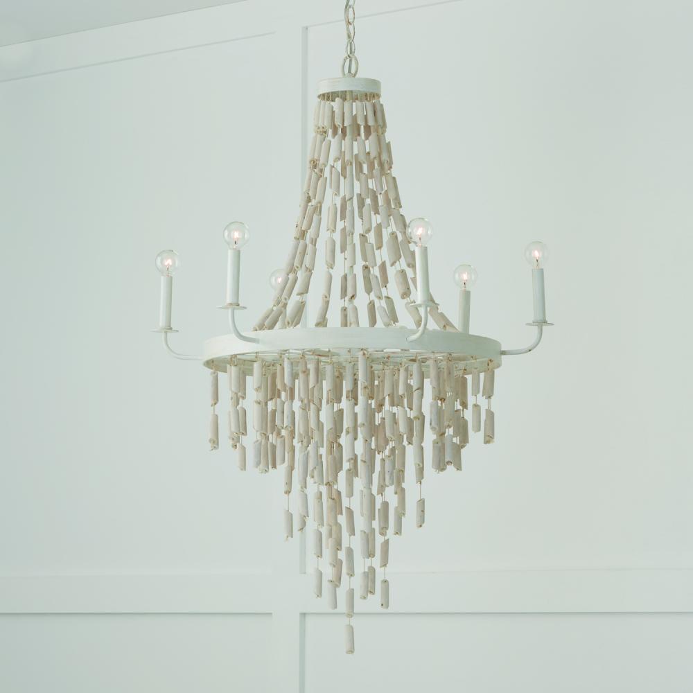 31"W x 42"H 6-Light Chandelier in Organic White with White Washed Natural Eucalyptus Beads