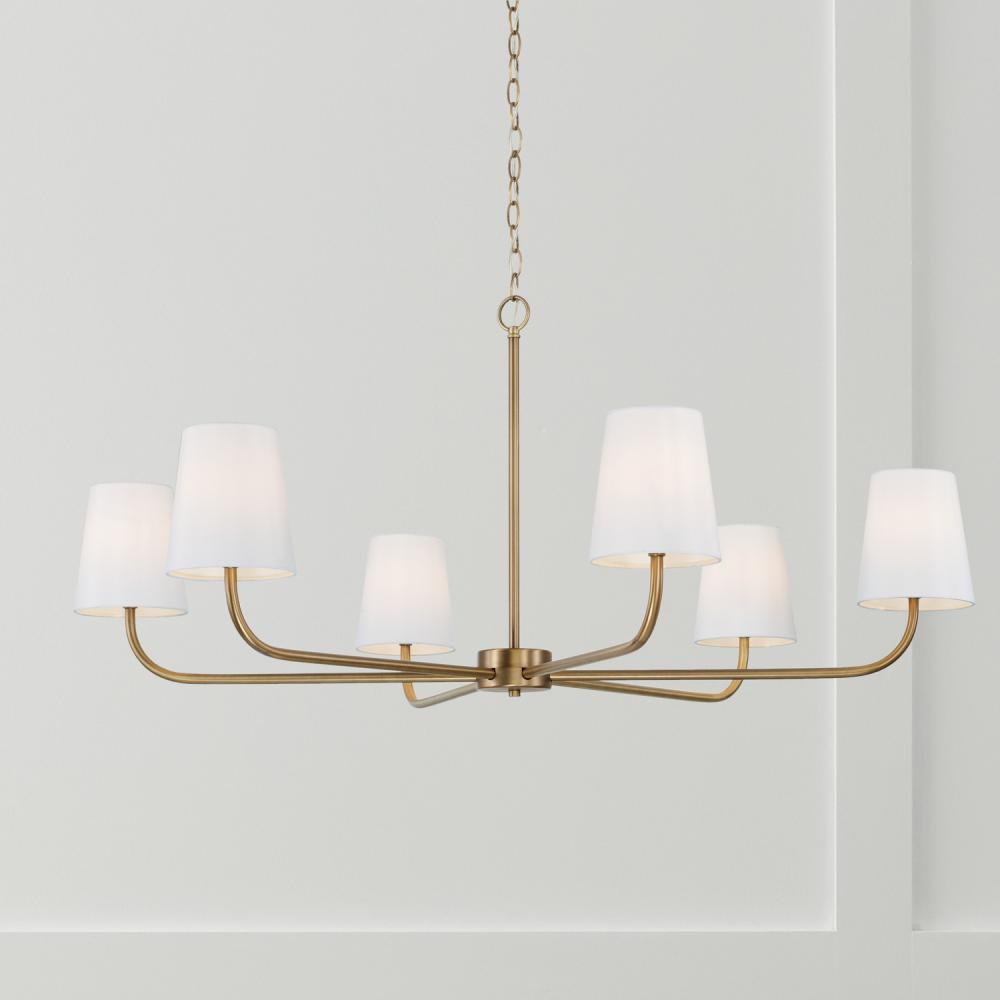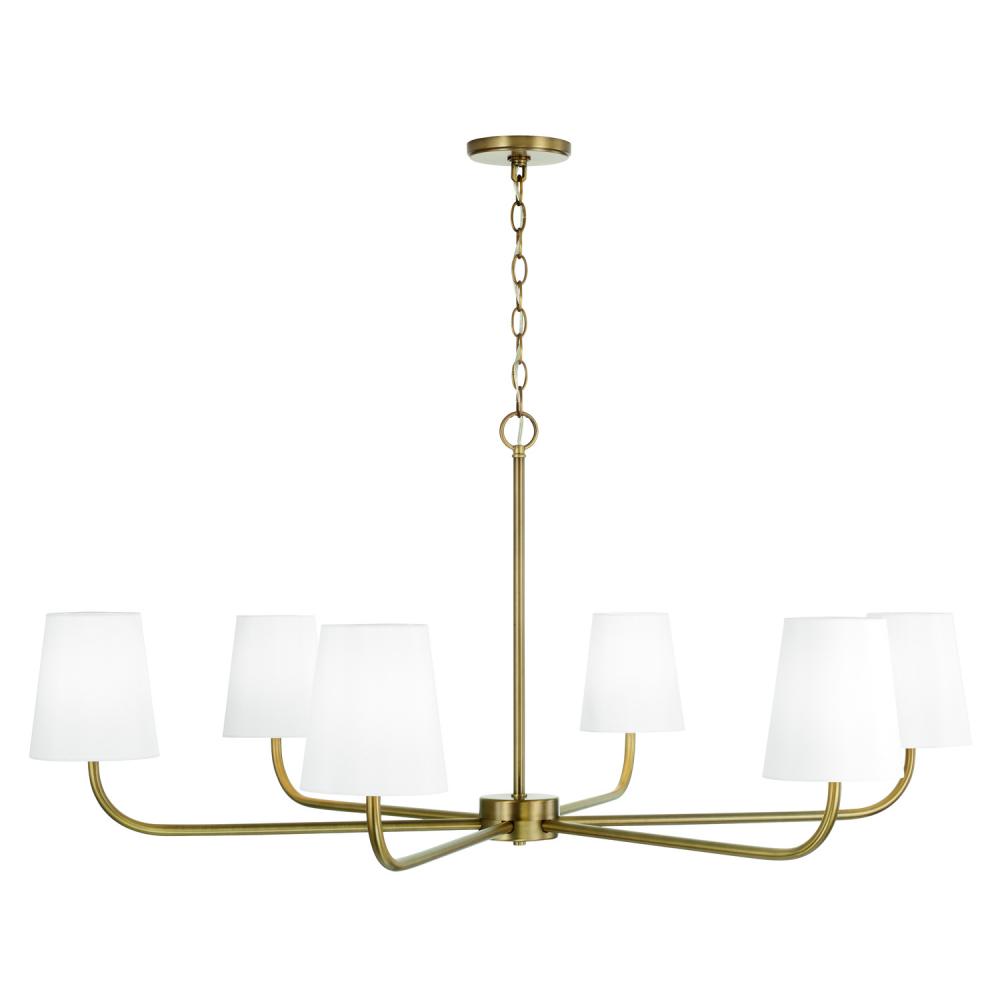 47"W x 21.25"H 6-Light Chandelier in Aged Brass with White Fabric Stay-Straight Shade