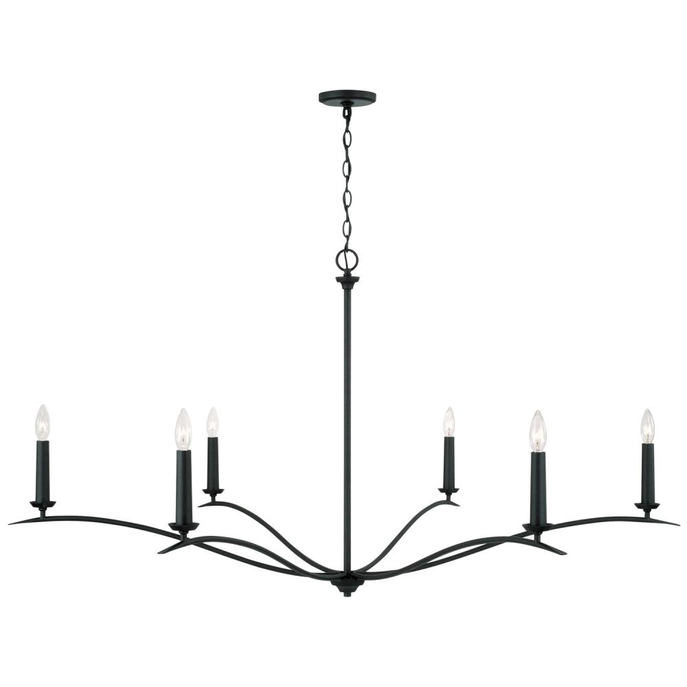 Soft curves create classic elegance in the Grady Chandelier. The round candle sleeves complement the sleek, elongated silhouette, while the Black Iron finish adds dimension to any space.