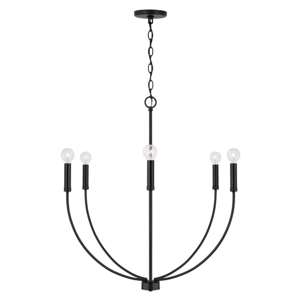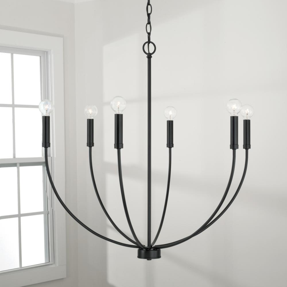 A classic shape refreshed with sleek contours and sweeping curves, the Ansley 6-Light Chandelier for HomePlace makes a statement that suits every style. The elongated arms and open silhouette invites standout style that doesn't overpower, while the Matte Black finish creates sophisticated contrast.