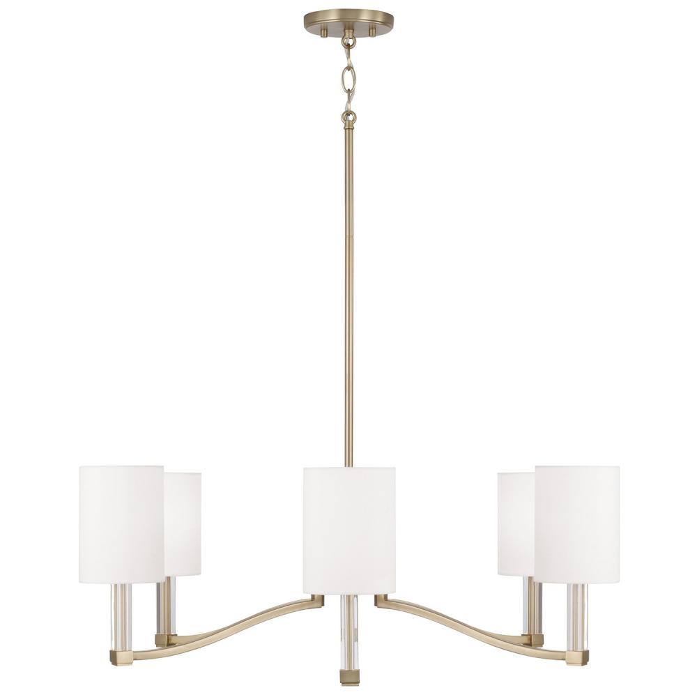 Blending transitional design with classic appeal, the Ingrid Large Chandelier brings sophistication to any space. The Matte Brass arms curve slightly to meet the crisp acrylic candlesleeves, topped with cylindrical White fabric shades for a neat, tailored look.