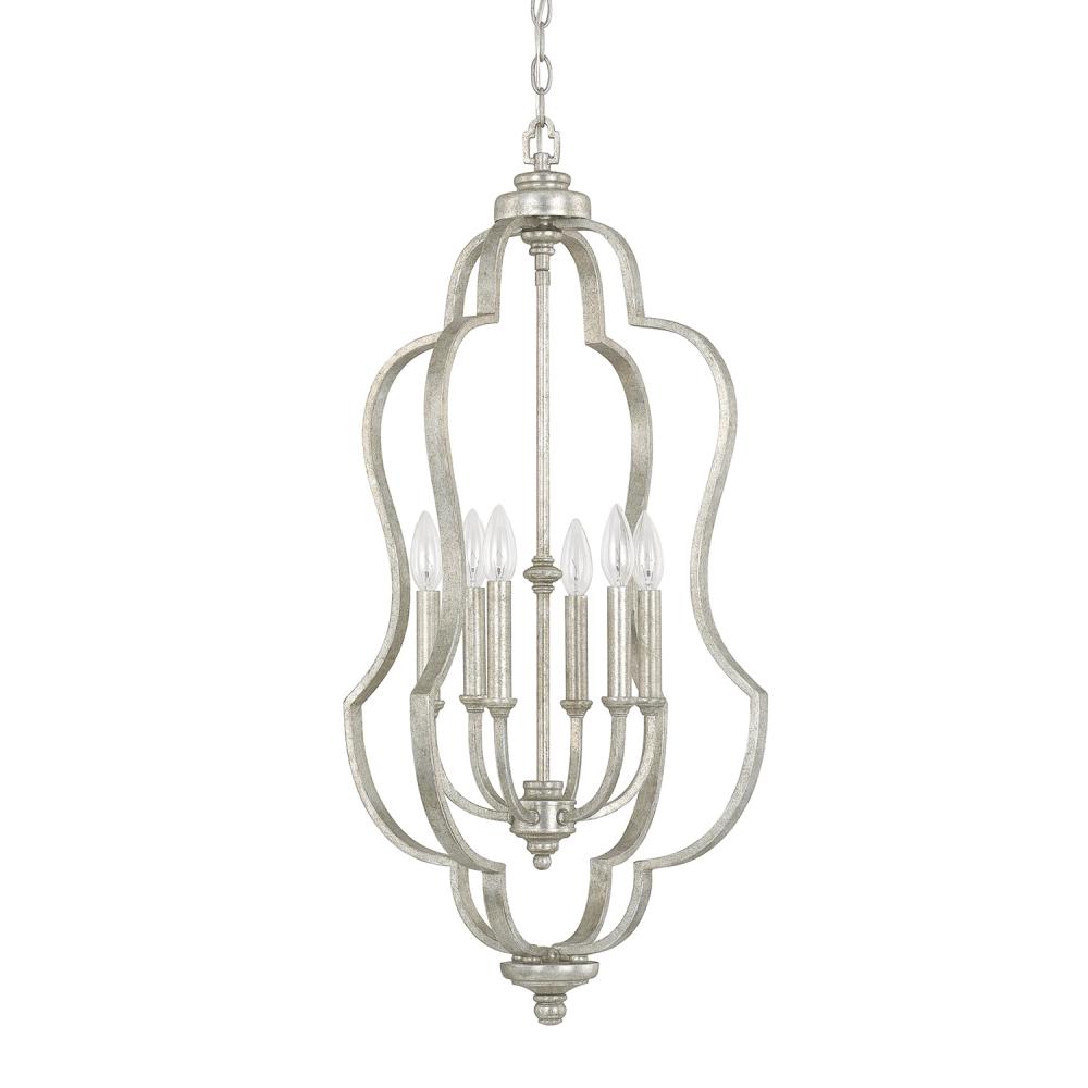 Six classic candle-style lights are suspended from a downrod and framed by the soft curves of our chic Blair 6-light foyer fixture. The vertical orientation of the glamorous transitional design is perfect in foyers or other transitional settings with high ceilings, finished in our Antique Silver for a lustrous shimmer.