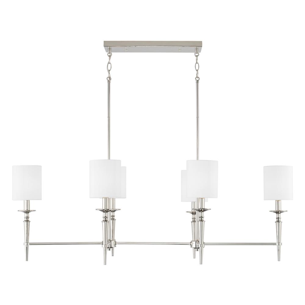 Straight edges and ornate candlestick detailing layers of drama to the Abbie 6-Light Island. The Polished Nickel finish brings a contemporary nod to this updated design.