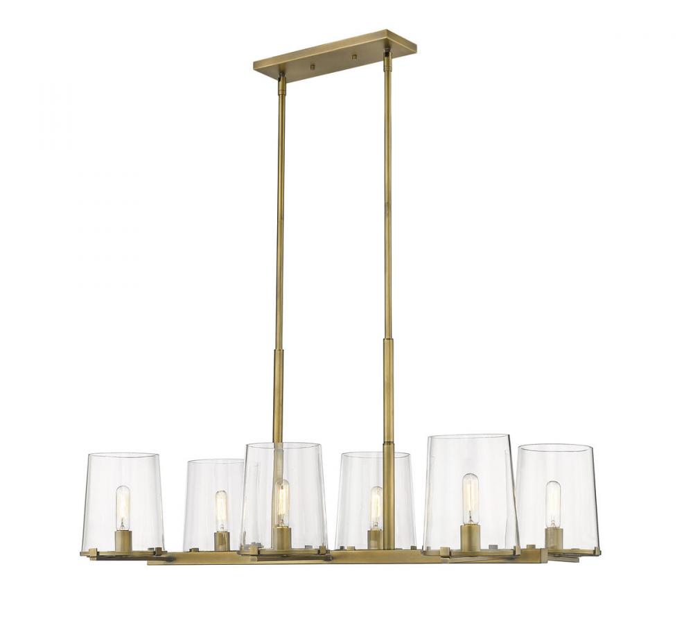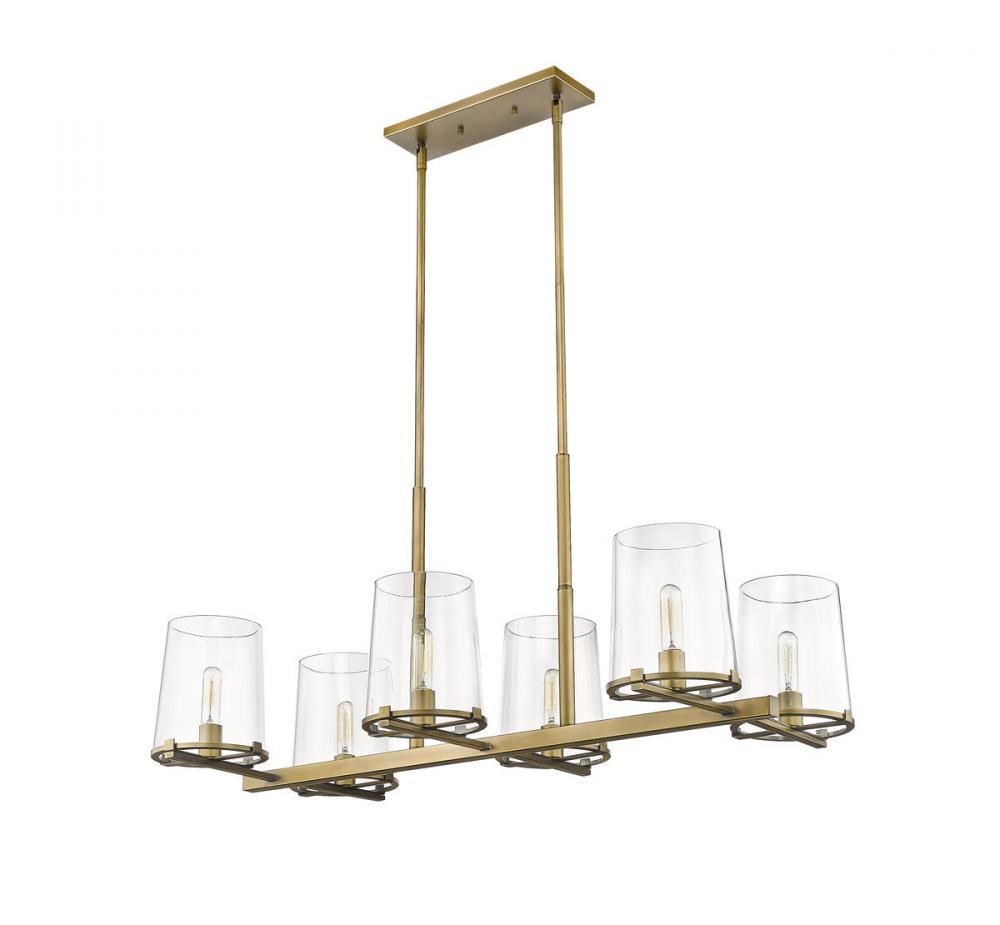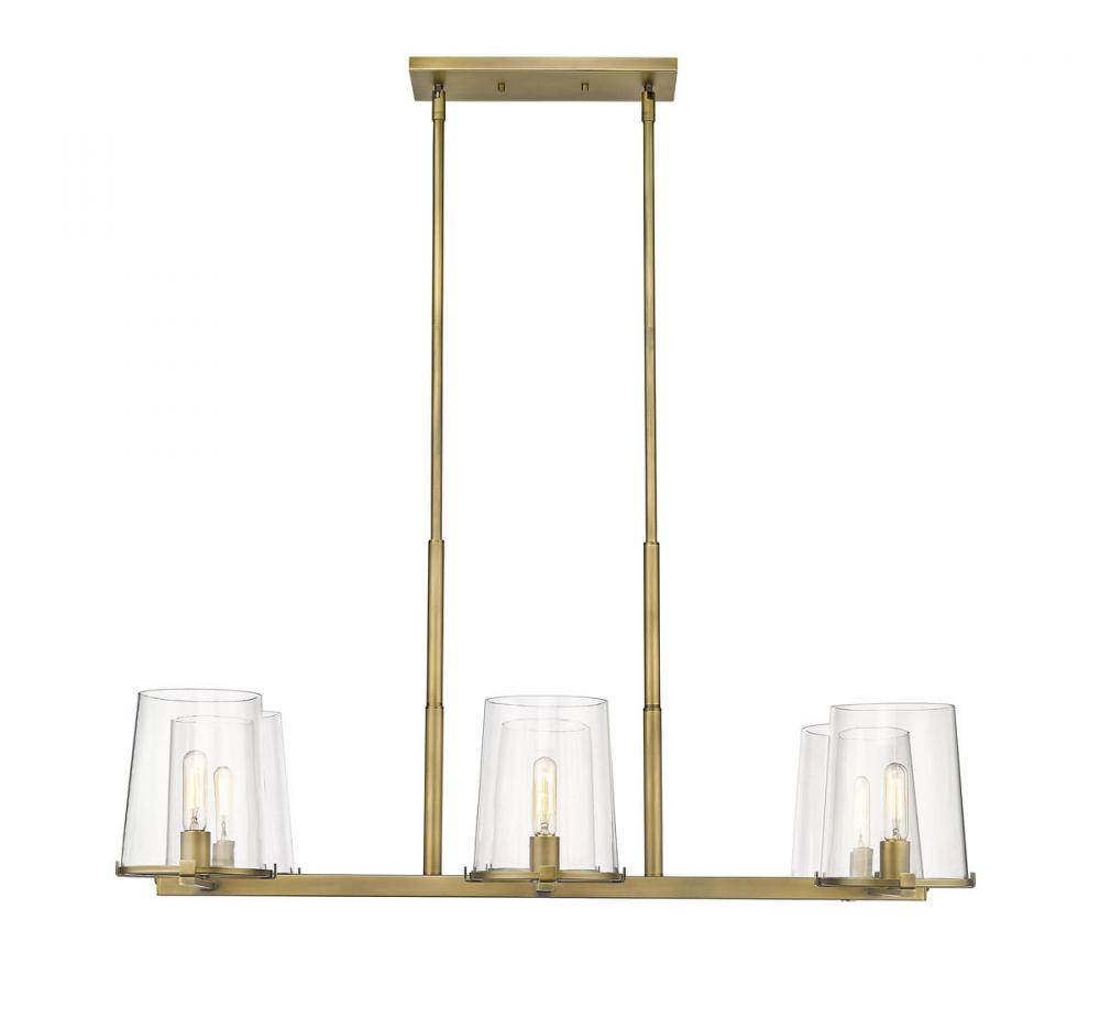 Sleek metal lines and a rich rubbed brass finish give this steel island light a sophisticated look. The design is enhanced by six clear glass shades to brighten any home with a luminous glow.