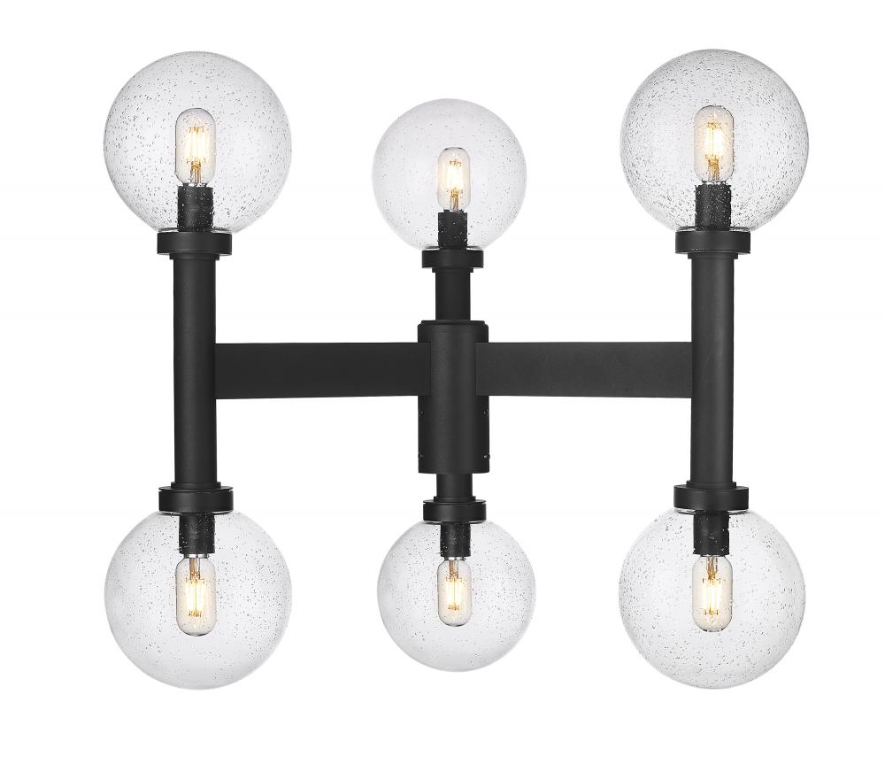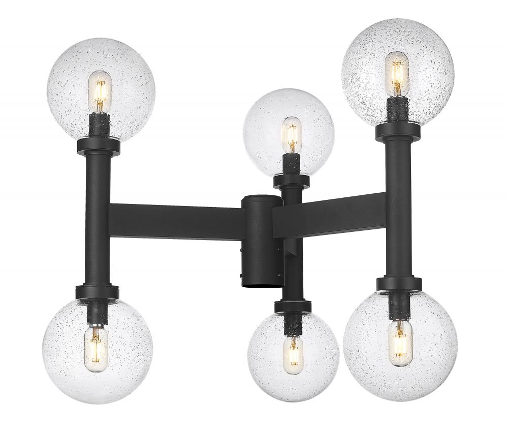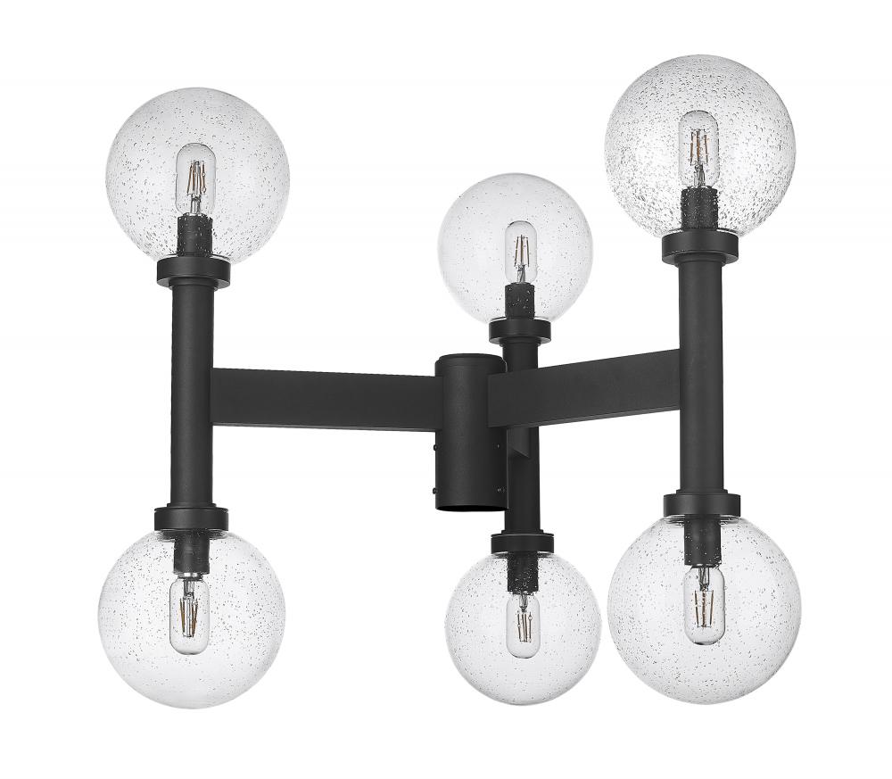 Glowing light sourced from a decadent fixture lifts the elegance in an exterior space when this six-light outdoor post mount fixture sits ready for placement. From the Laurent collection, it preserves a classic village aesthetic with a sophisticated, straightforward linear aesthetic. A black finish aluminum frame makes a stunning venue to host six delicate clear seedy glass globe shades, creating an impressive festive look.
