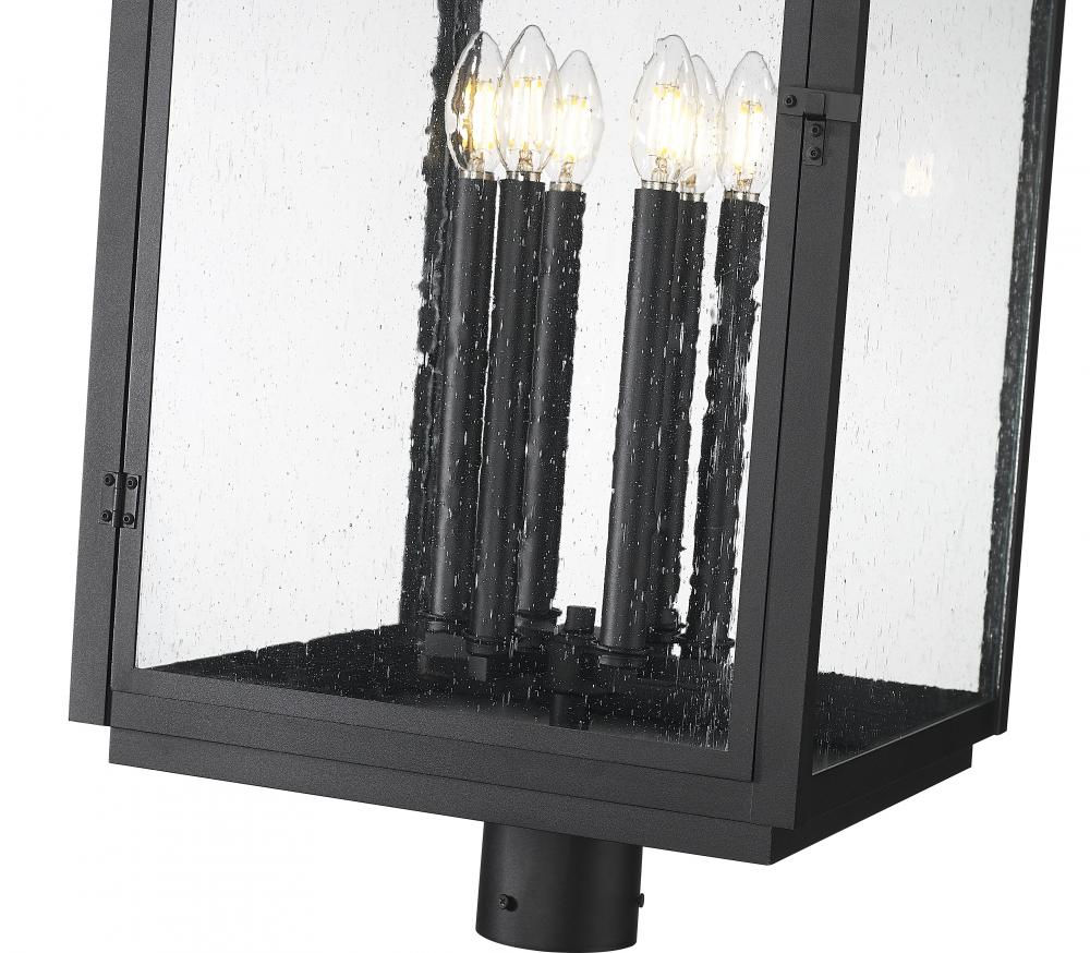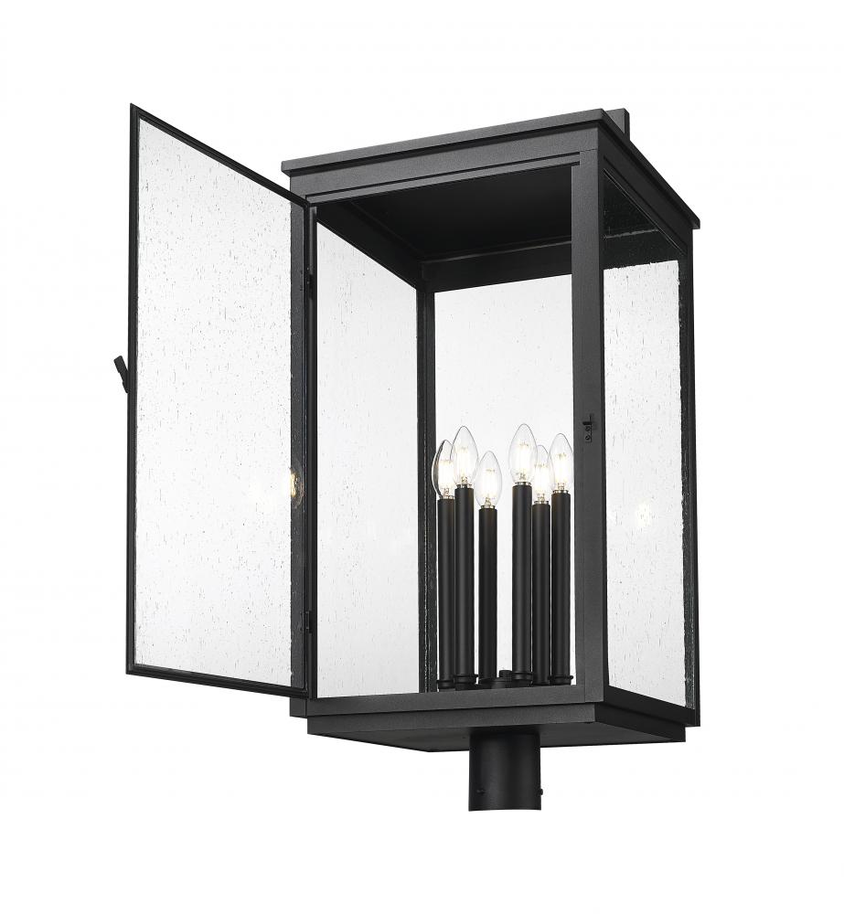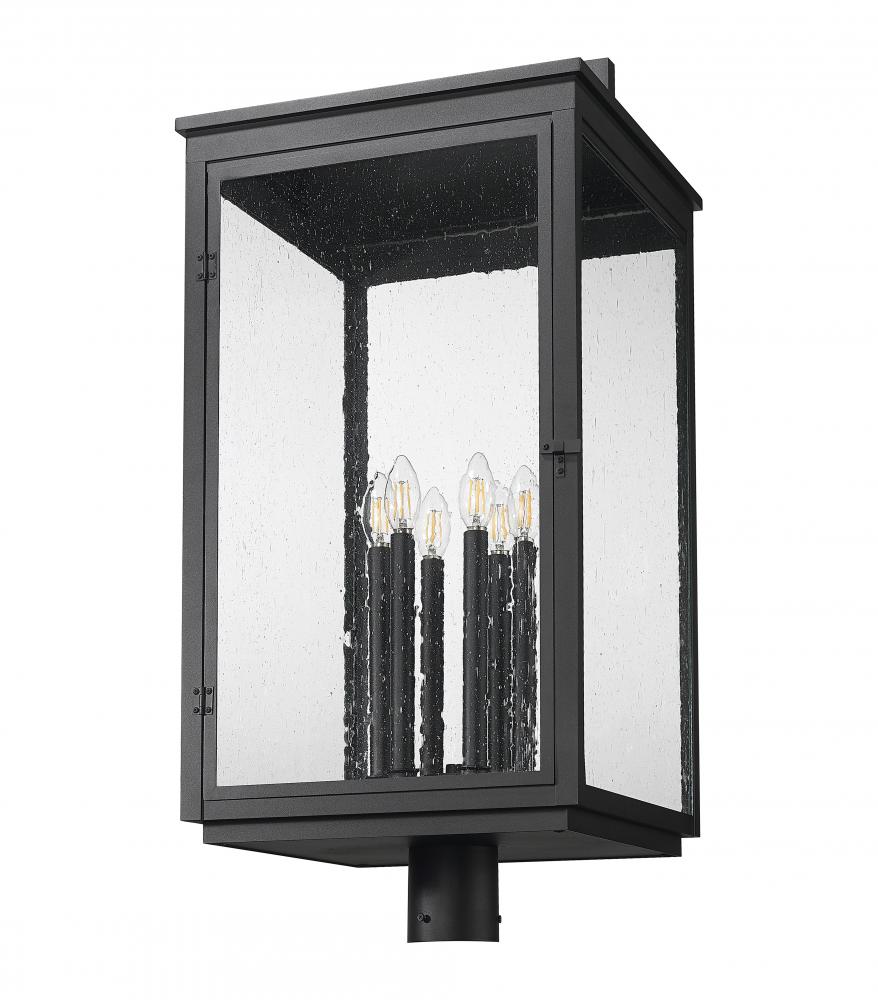 Speaking of style, this post mount fixture in sand black finish commands attention with its grand scale and graceful crown. Clear seedy glass encases six candle-style lights that offer a striking, atmospheric glow. It?s the ultimate finishing touch for bold exteriors and expansive entrances.
