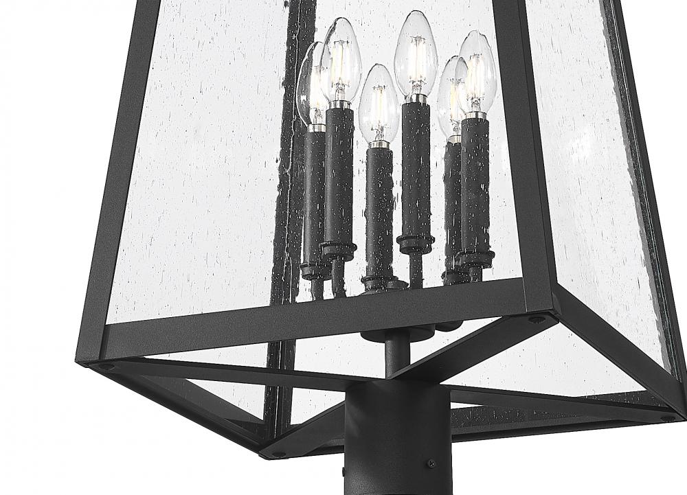 This six-light outdoor post-mounted fixture delivers an alluring look perfect for custom exterior spaces. With a timeless stacked pole paired with a classic lantern, it offers a pole and frame in Coastal black finish aluminum. Seedy clear glass panels and a candelabra light cluster add romantic charm, while dimmability adds flexibility to create the perfect ambiance.