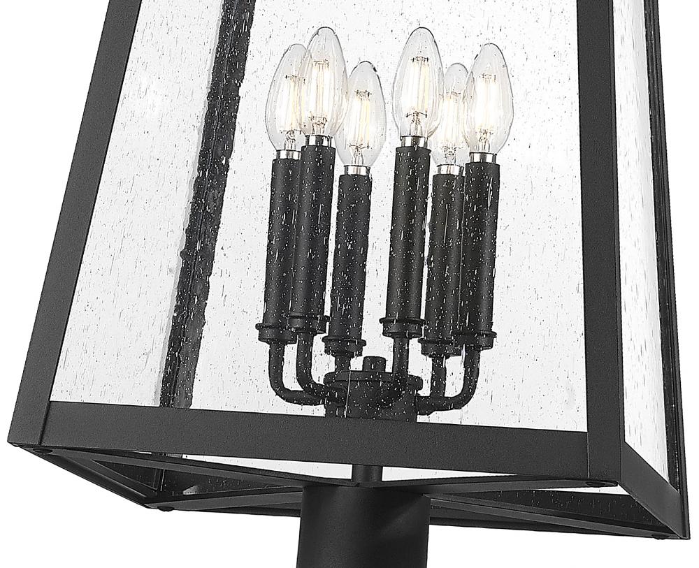 Updated village charm is modern and fresh as this six-light outdoor post-mounted fixture enhances your curated landscaping. It pairs a stacked pole profile with a lantern-inspired light on top, complete with a Coastal black finish on aluminum. Seedy glass adds the perfect dose of vintage depth and texture, while a candelabra light cluster adds a call-back to a bygone era.