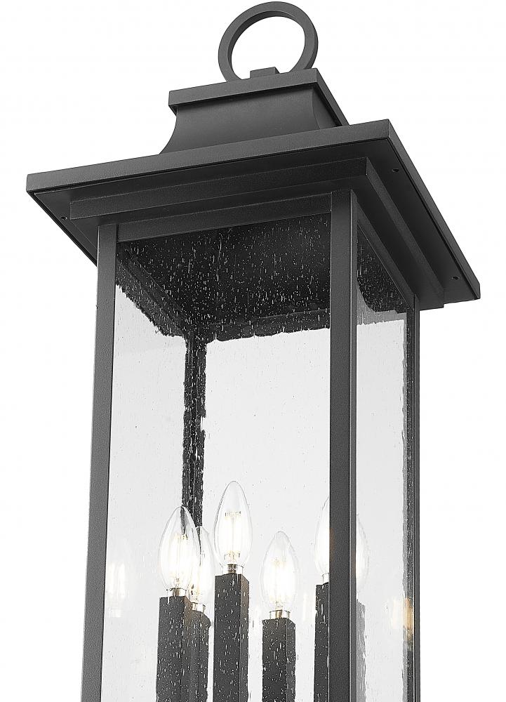 In a coastal black finish that holds up to the weather, this transitional six-light outdoor post mount light is the perfect way to create curb appeal for your home. It features a decorative lantern silhouette, complete with a flared cap and ring finial. Seeded glass is clear and crisp, offering dimension while assuring bright, direct illumination from the candelabra lights tucked within.