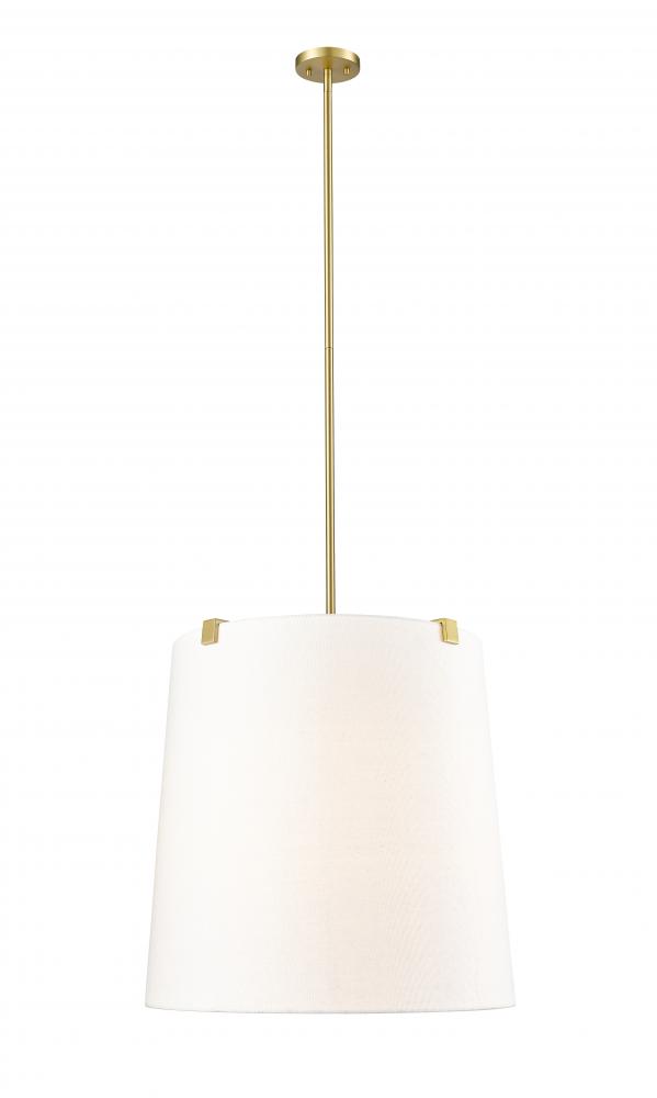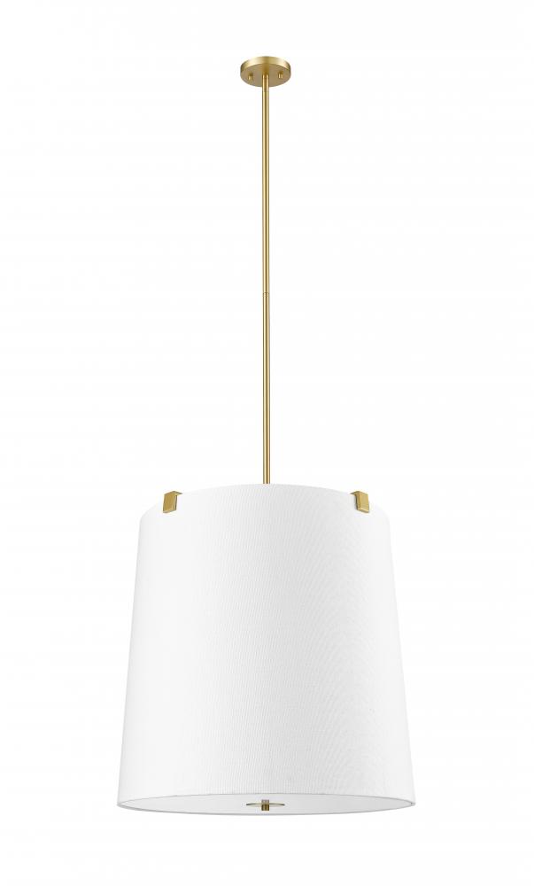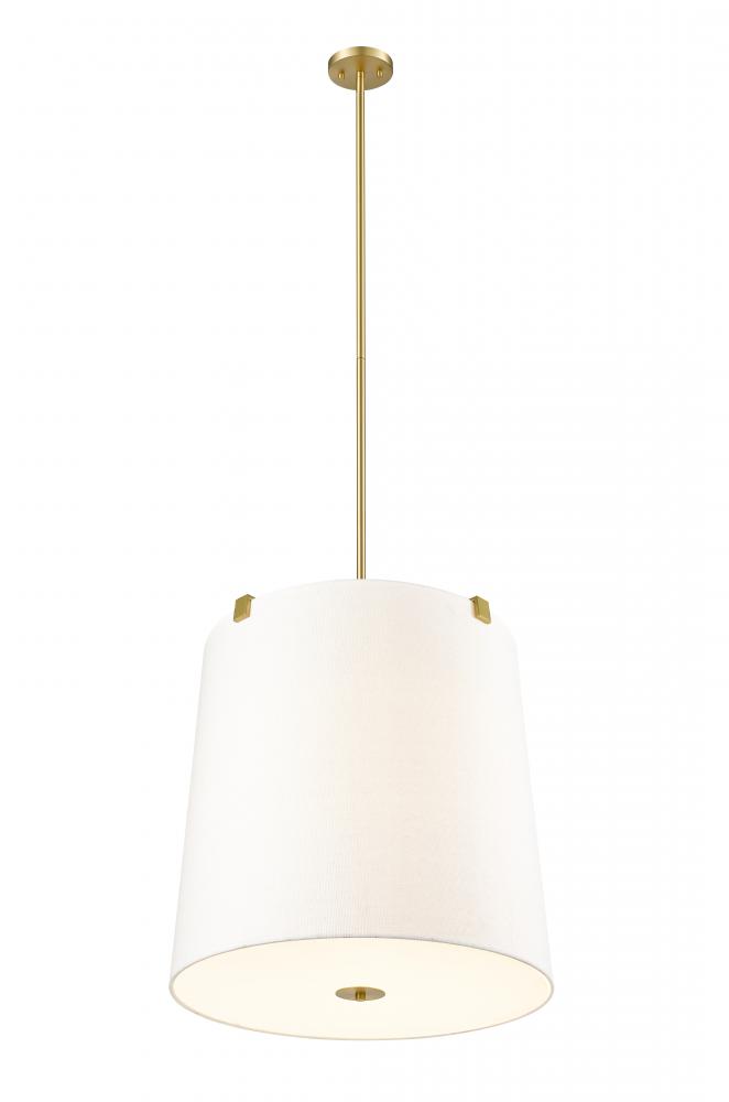 This tastefully styled six-light pendant reflects a tribute to conventional yet chic traditional aesthetic. Cool modern gold finish steel framing with clips attaches to a white linen fabric shade, offering a low-profile vibe, as candelabra lights diffuse illumination beautifully. This fixture is dimmable, creating mood lighting and efficient functionality.