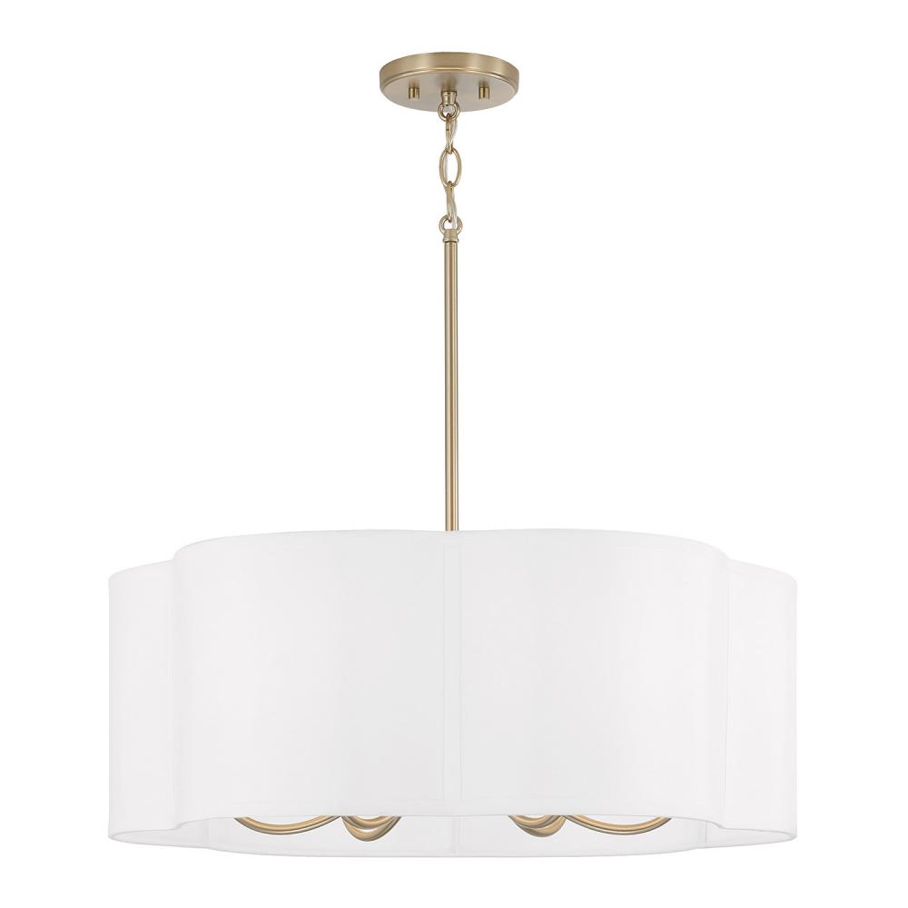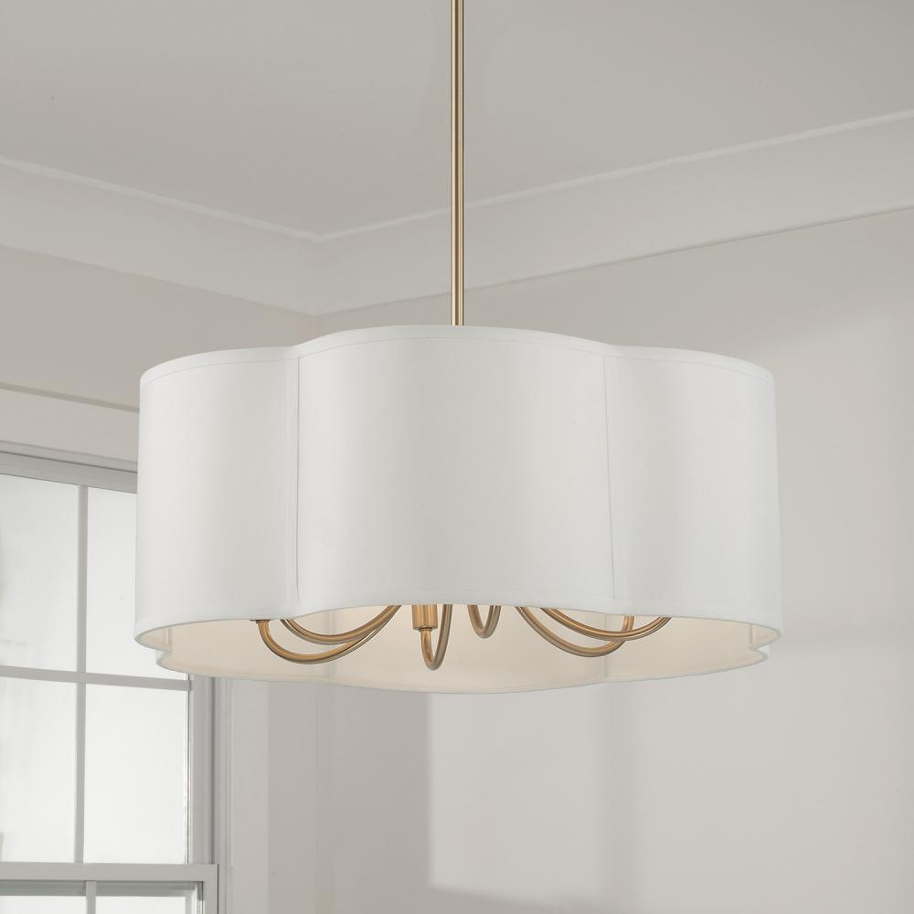 Evoking a floral form with chic designer details, the 24 inch wide Sabine Pendant brings showstopping style to any space. The sleek Matte Brass arms curve upward within the scalloped White fabric shade, making this unique luminaire captivating from every angle.