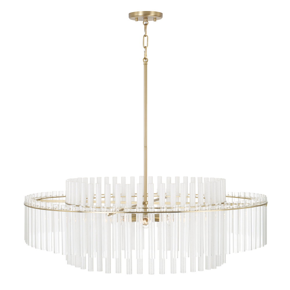 Illuminate captivating dimension. With an inner ring of long, Etched glass tubes nestled inside an outer ring of shorter, clear glass tubes, the Blair Grand Pendant brings layers of enchanting shine to any space. The elegant Aged Brass finish perfectly complements the cascading silhouette.