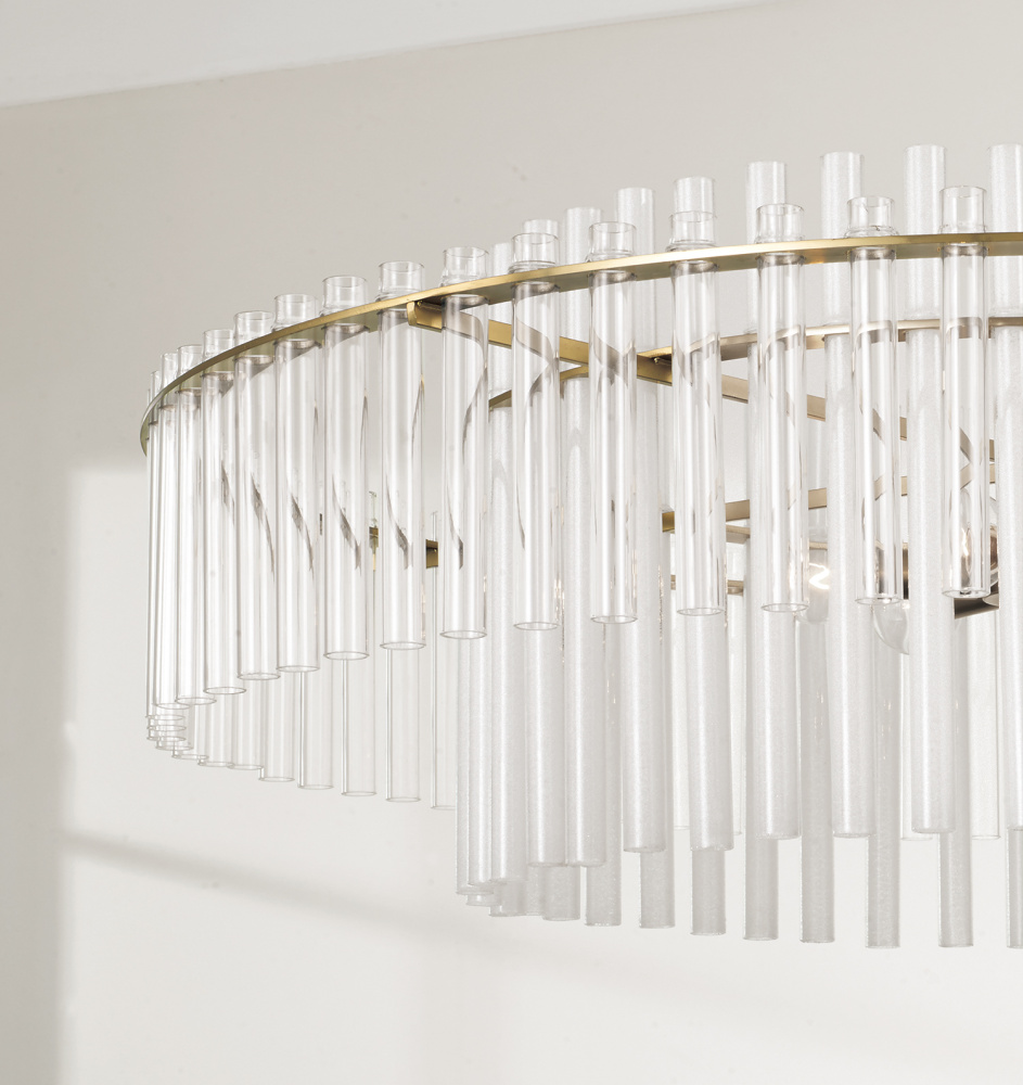 DETAILS: An inner ring of long, frosted glass tubes sit inside an outer ring of shorter, clear glass tubes for layers of enchanting illumination, perfectly complemented by the Aged Brass finish.