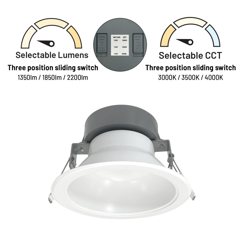 Lumens / Wattage: Selectable Lumens (1350lm / 12W; 1850lm / 16W; 2200lm / 20W)