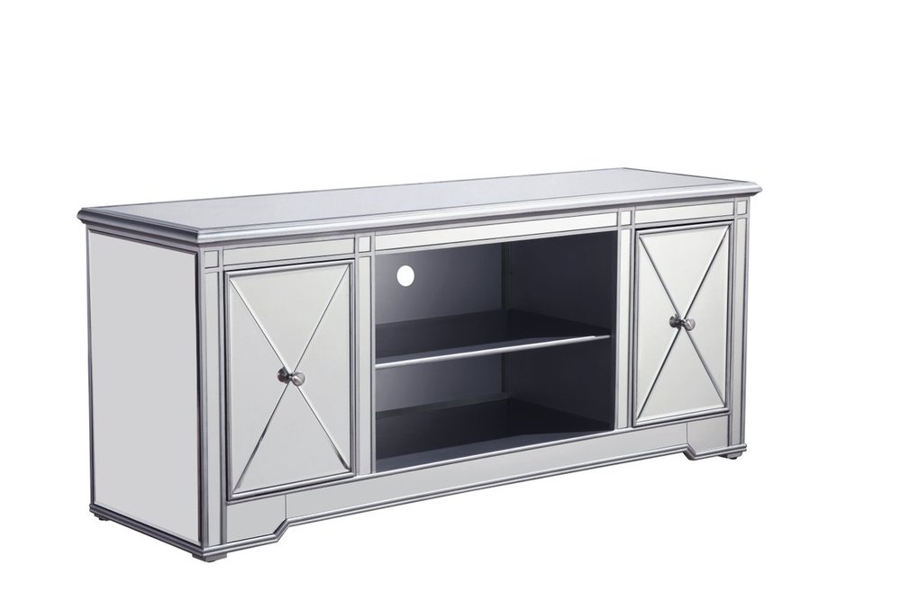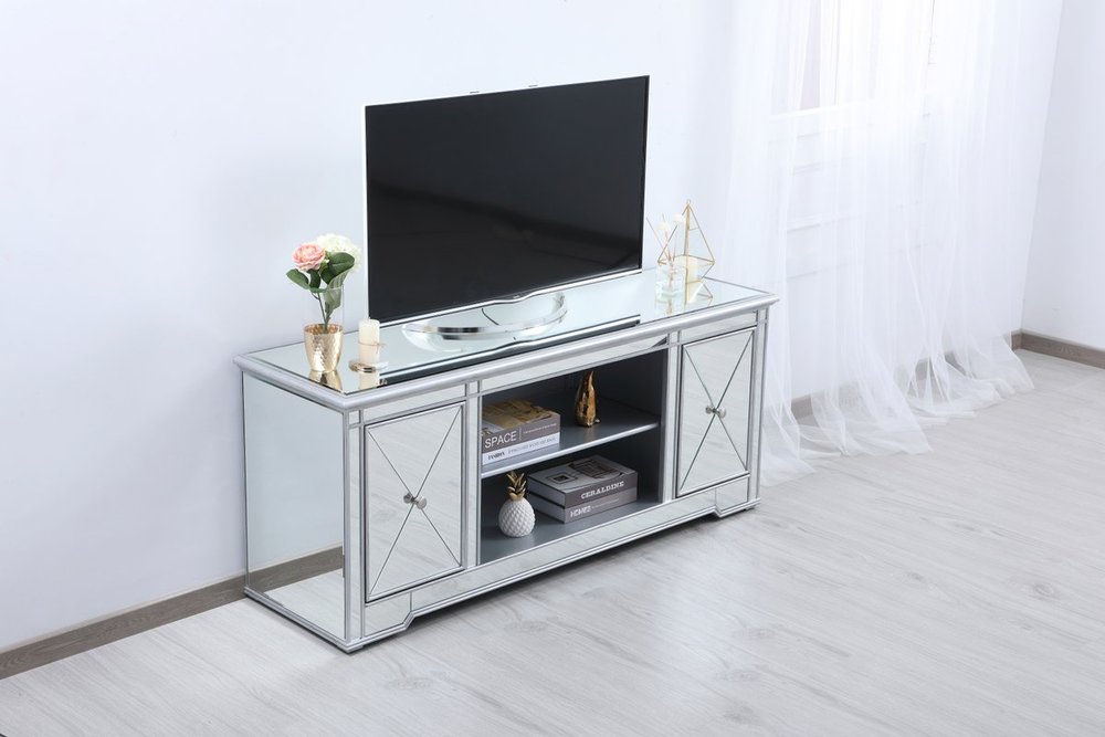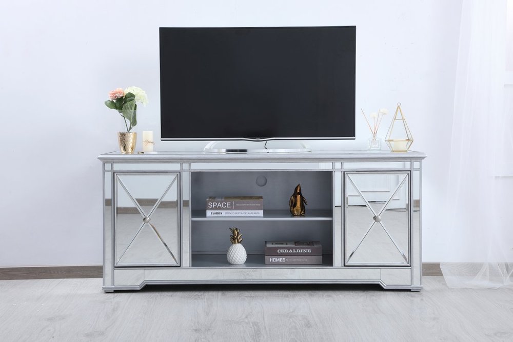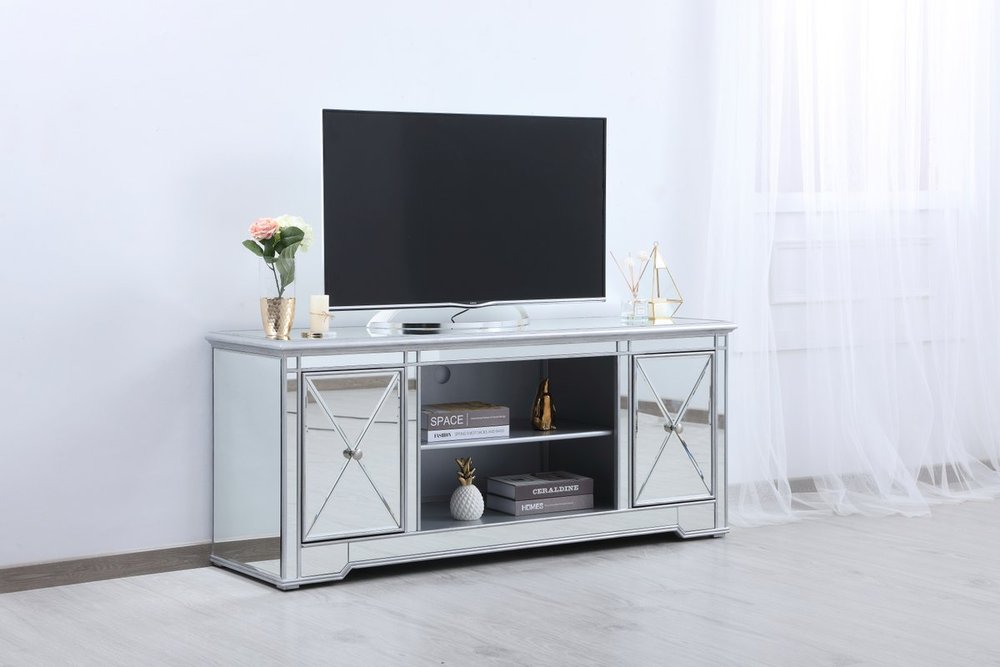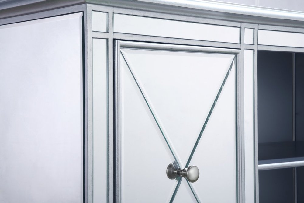 Sleek and vibrant, this classy media cabinet will make a striking statement in any room can showcase up to a 60" flat screen TV at a perfect height. Featuring gleaming criss-cross style mirror panel and hand-rubbed silver finish, brushed steel knobs. Functional and chic, with 2 soft-closing side doors, center opening and shelvings, it provides plenty of storage for your equipment, games, and books.